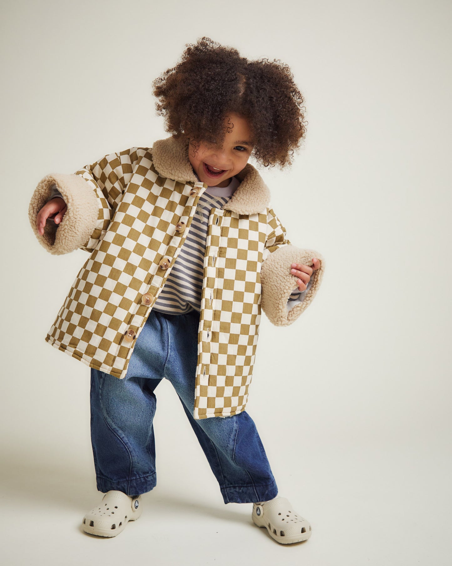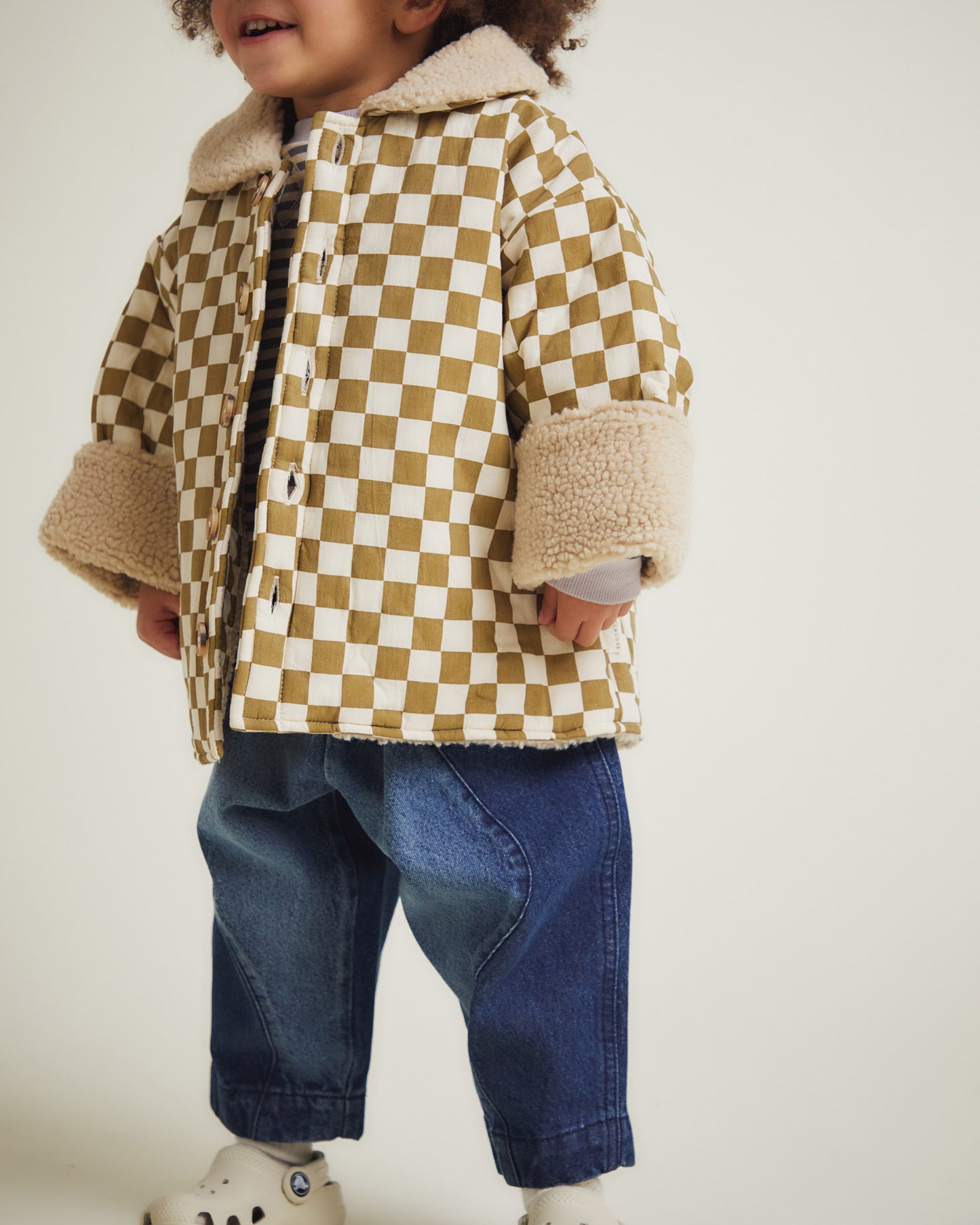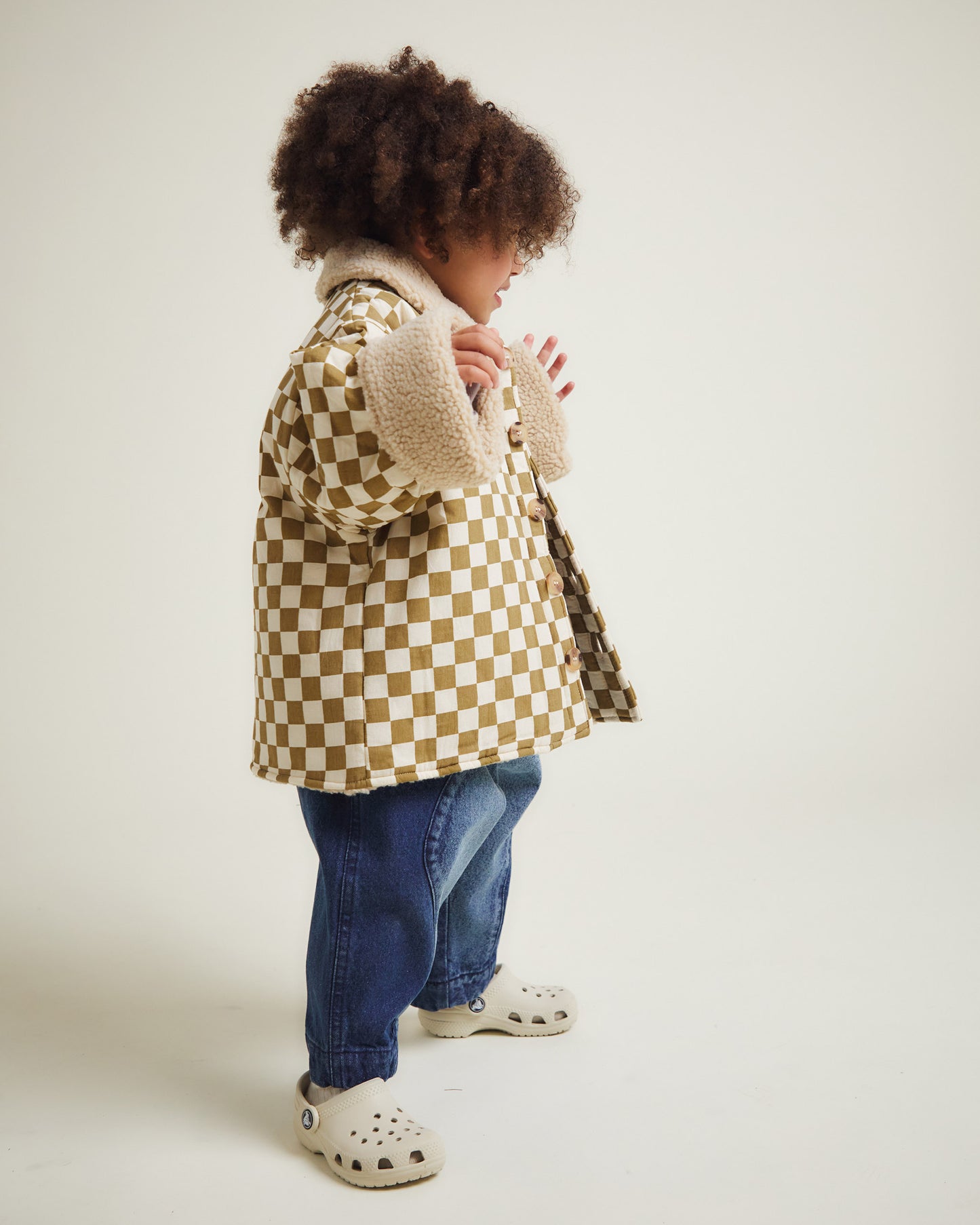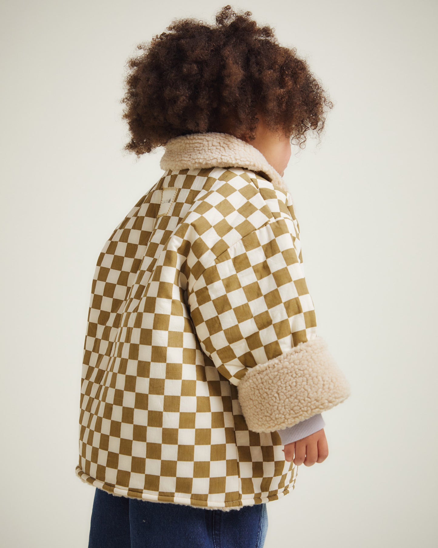 Crafted with a 100% cotton outer in our iconic checkerboard pattern, our Emery jacket is fully lined with soft oatmeal borg for warmth and quilted polyester sleeves for easy layering. Large smokey tortoiseshell buttons, side pockets, and turn-back cuffs add both function and style, all finished with Bold Claude branding (of course!).