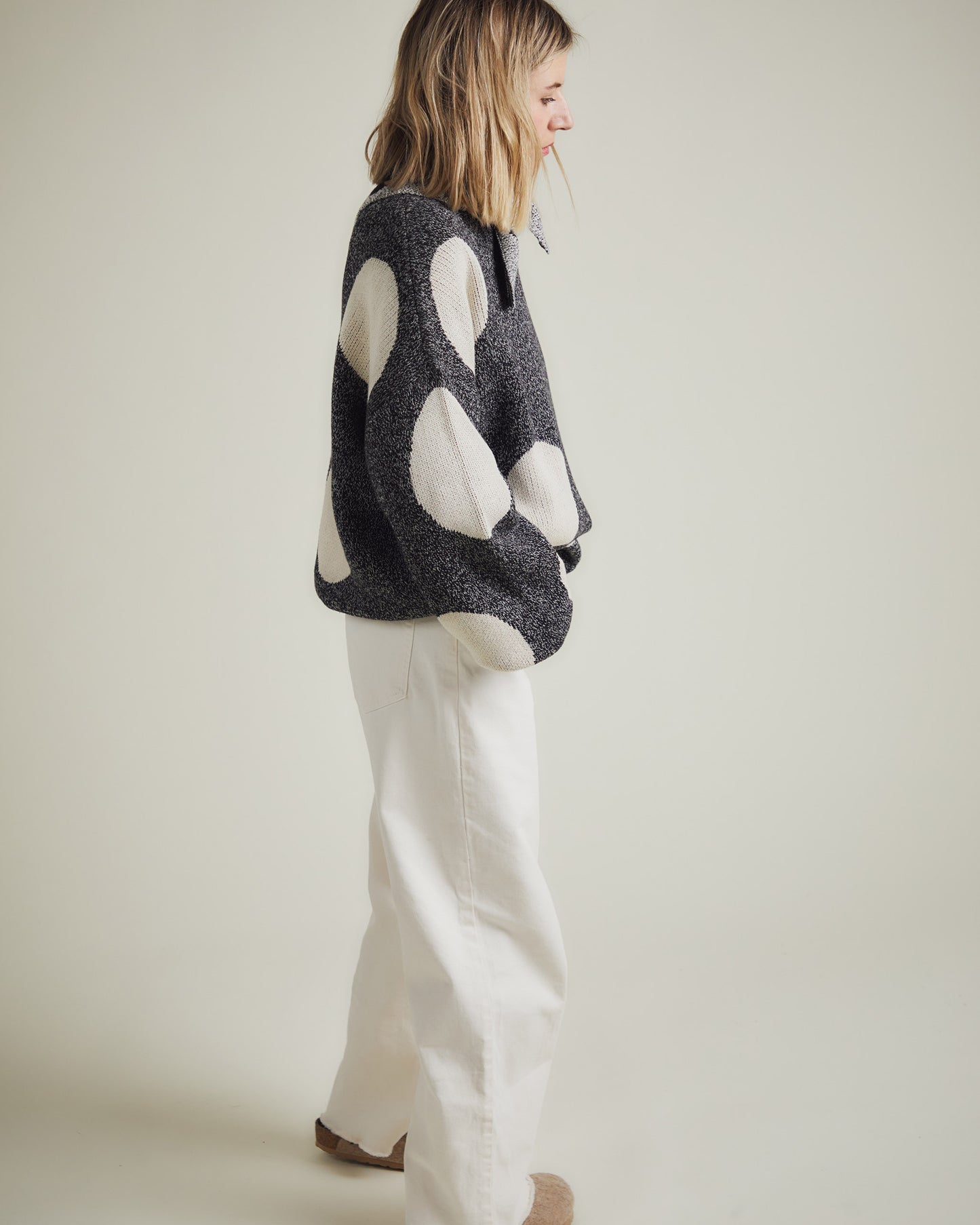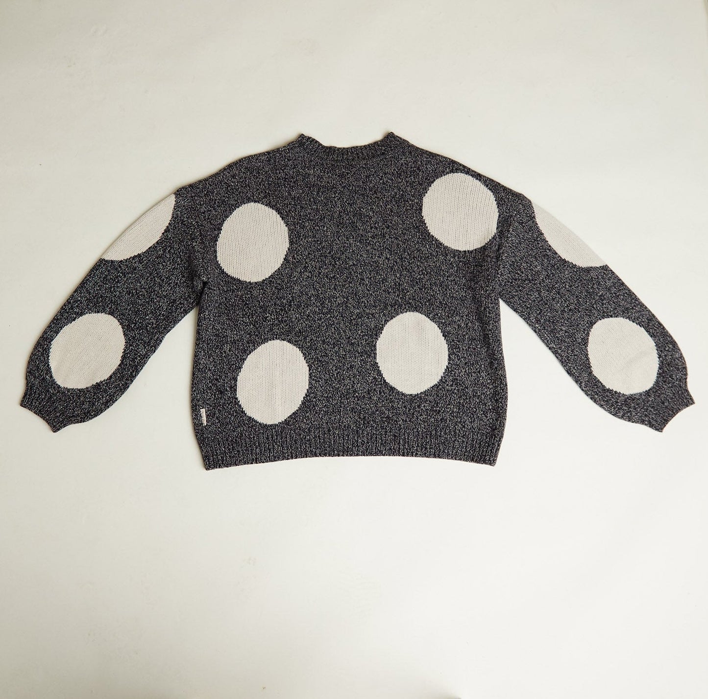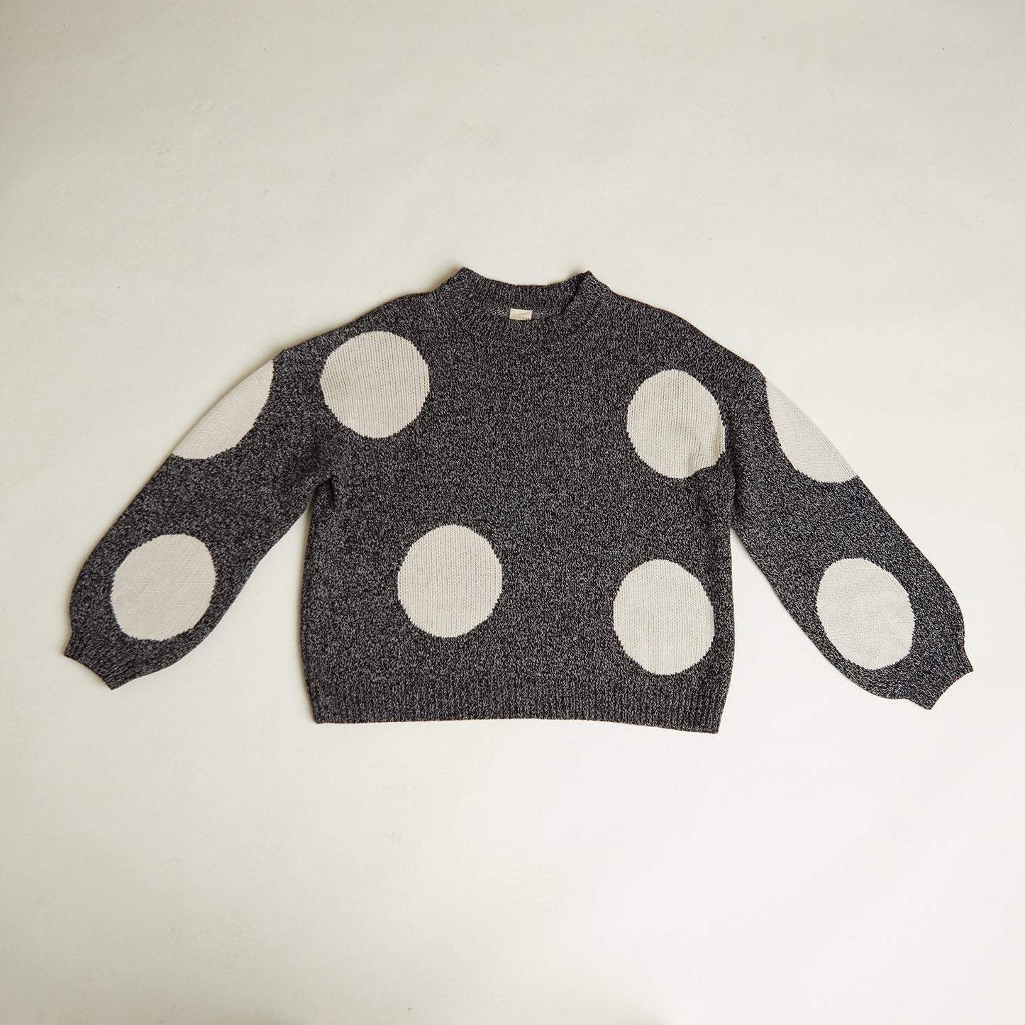 The Lori Spot Noir Sweater. Crafted from 100% organic cotton twisted yarn and finished with an oat polka-dot pattern. Designed to be easy to wear with a cropped, oversized, & slouchy silhouette.