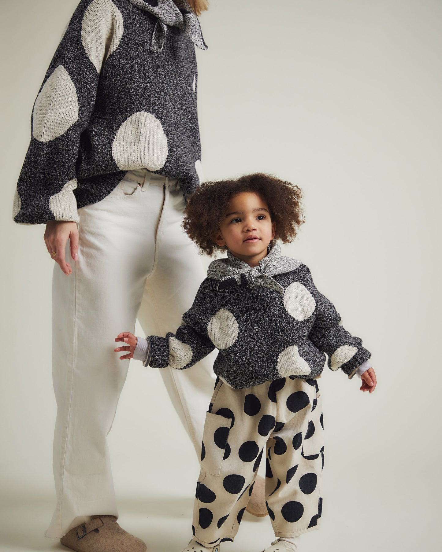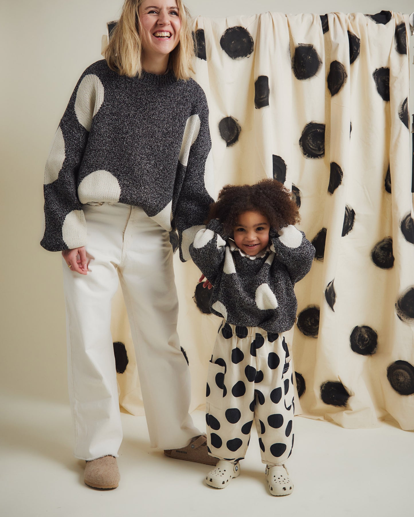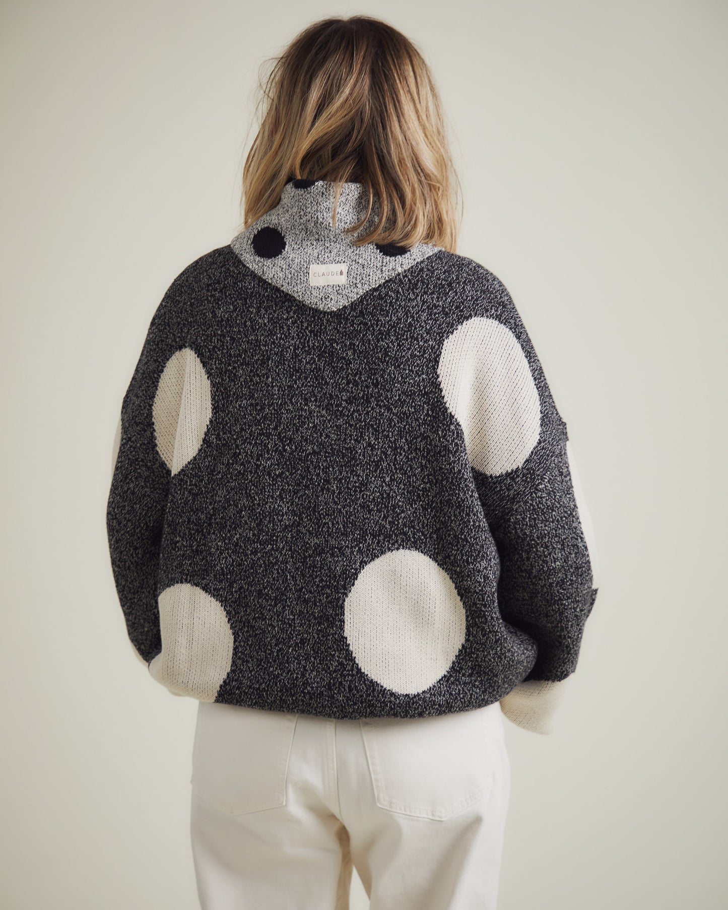 The Lori Spot Noir Sweater. Crafted from 100% organic cotton twisted yarn and finished with an oat polka-dot pattern. Designed to be easy to wear with a cropped, oversized, & slouchy silhouette.
