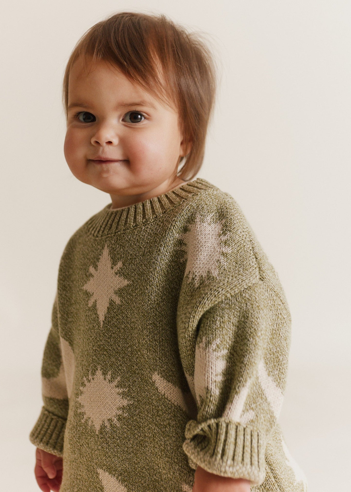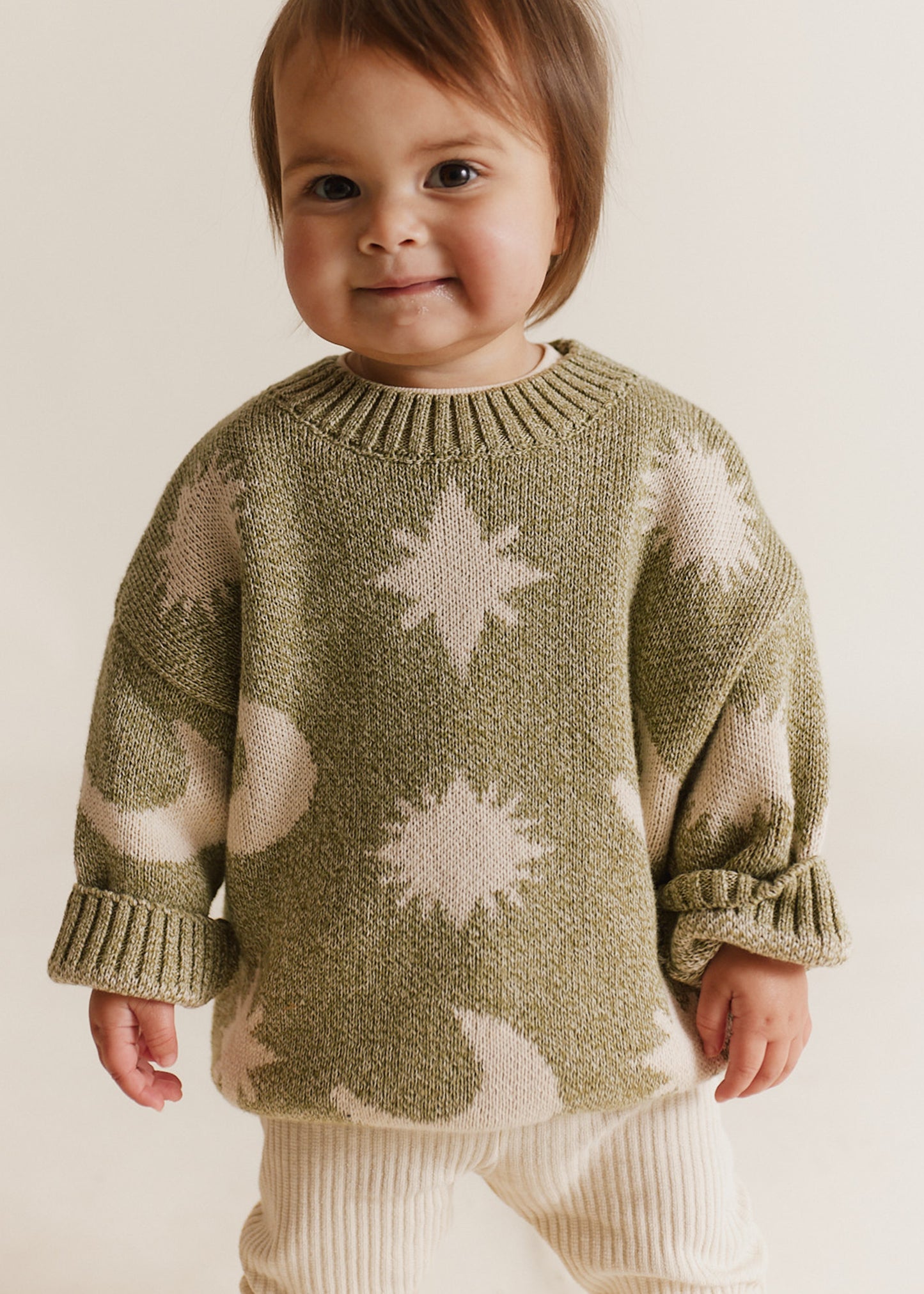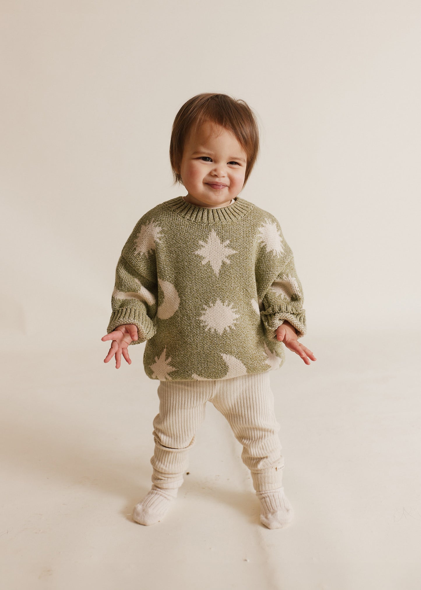 Featuring our iconic celestial pattern, and the slouchy fit you’ve come to love from us, this soft knitted jumper – alike all our knitwear range – is the perfect wardrobe staple; it layers over any outfit to offer an effortlessly stylish look (perfect for parents who don’t always have time for styling), transitions seamlessly from a breezy summer evening to a cosy winter day, and has lots of room to grow into, so your child will love it for a long time. Versatility is its powerhouse.
