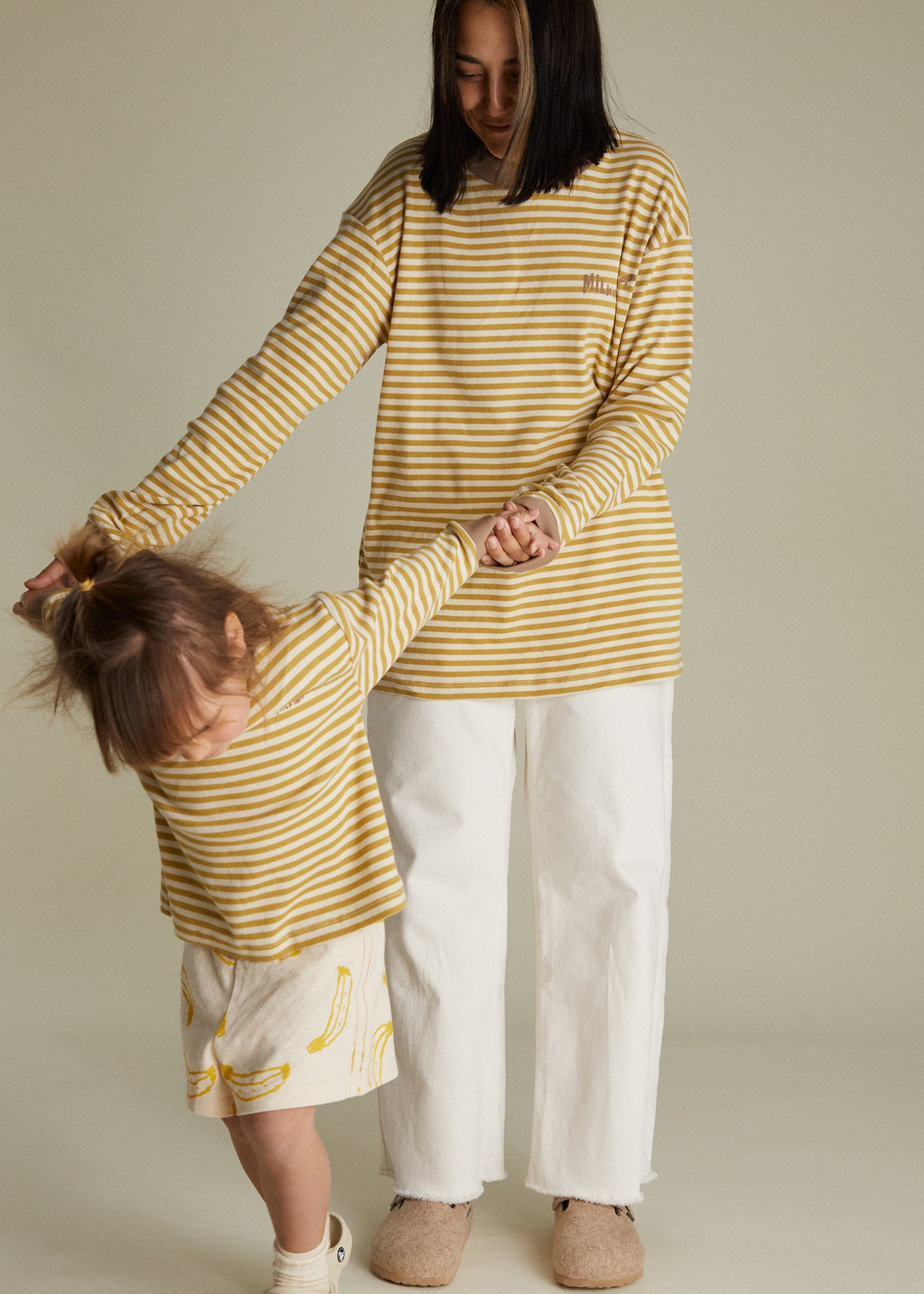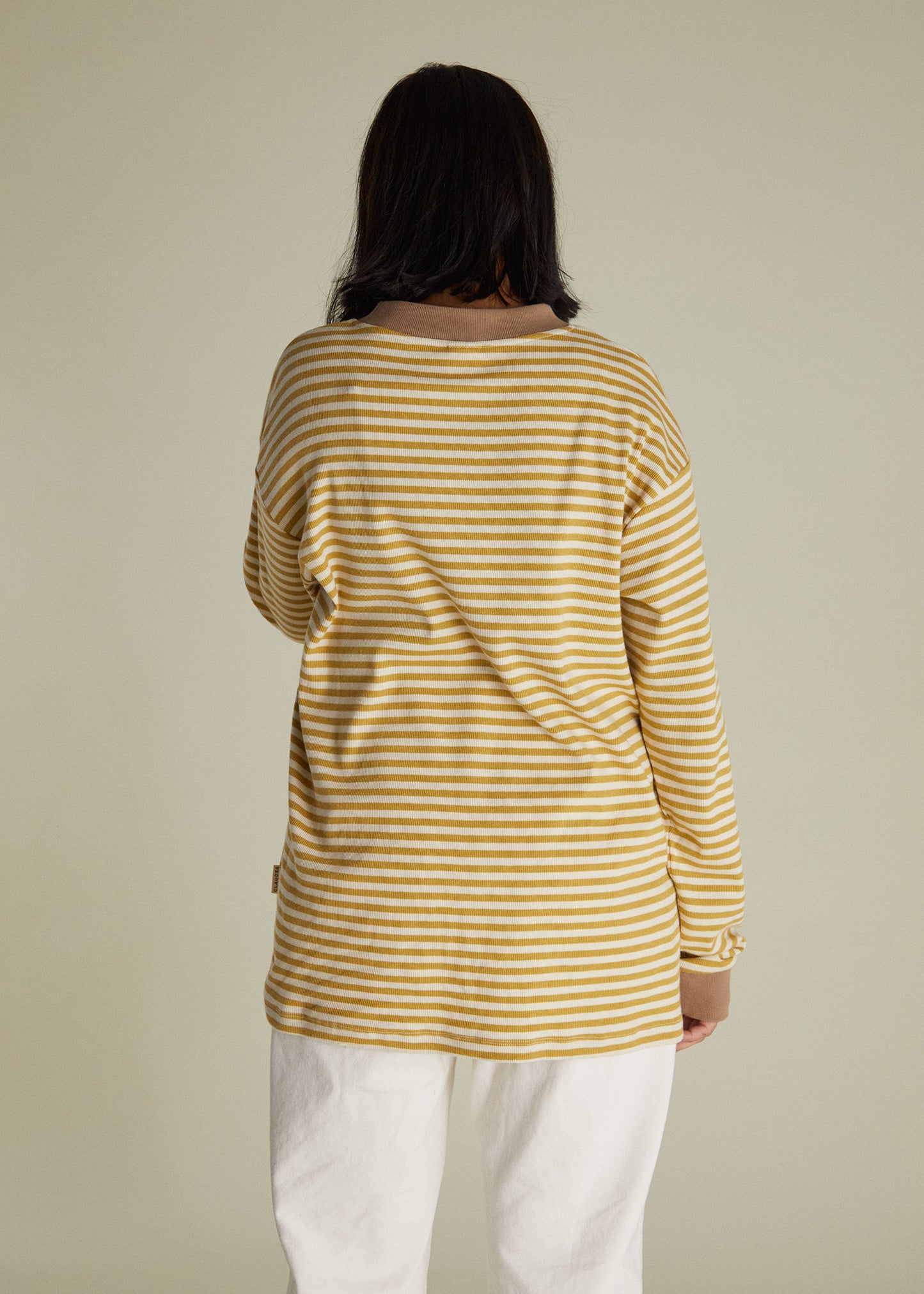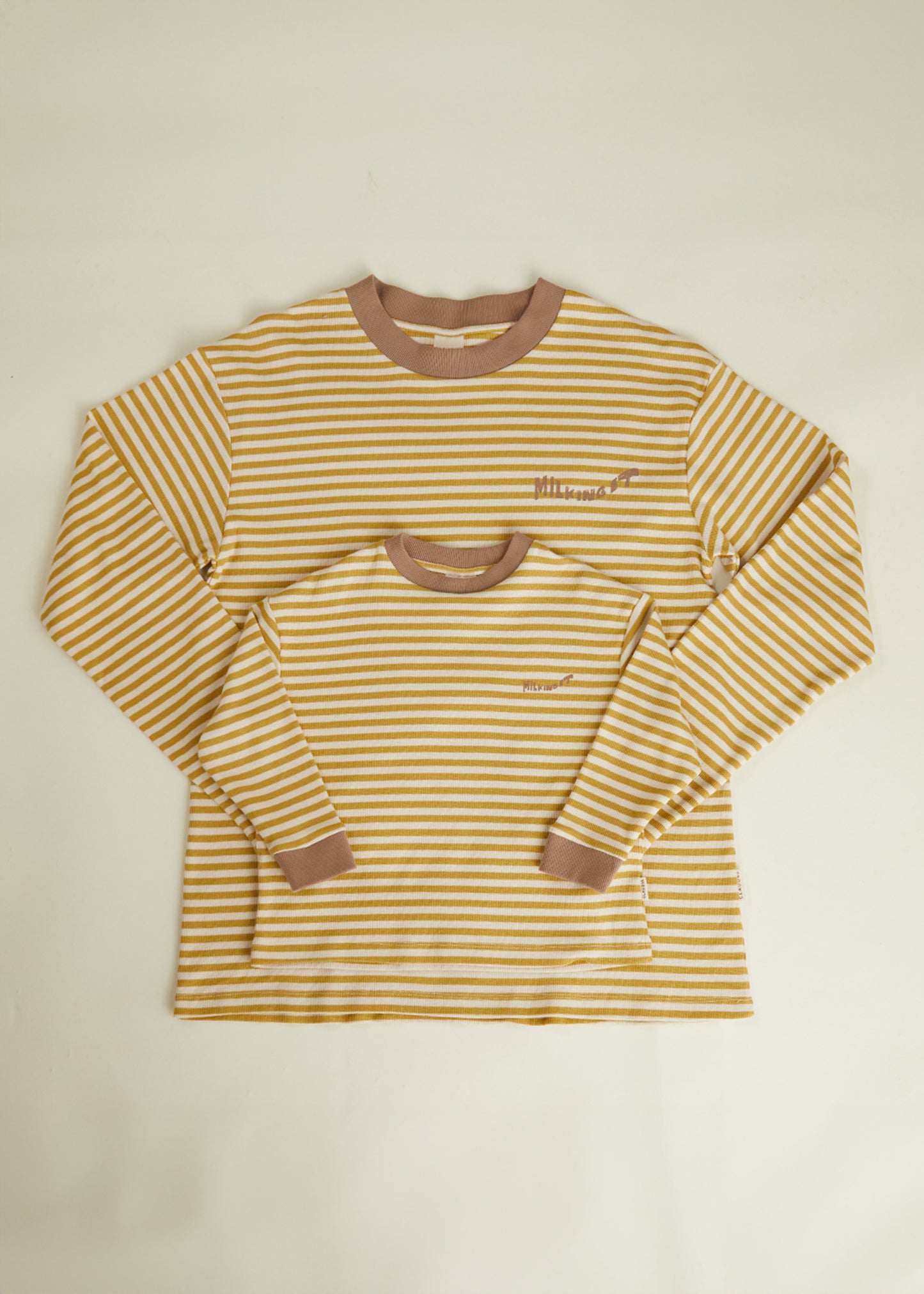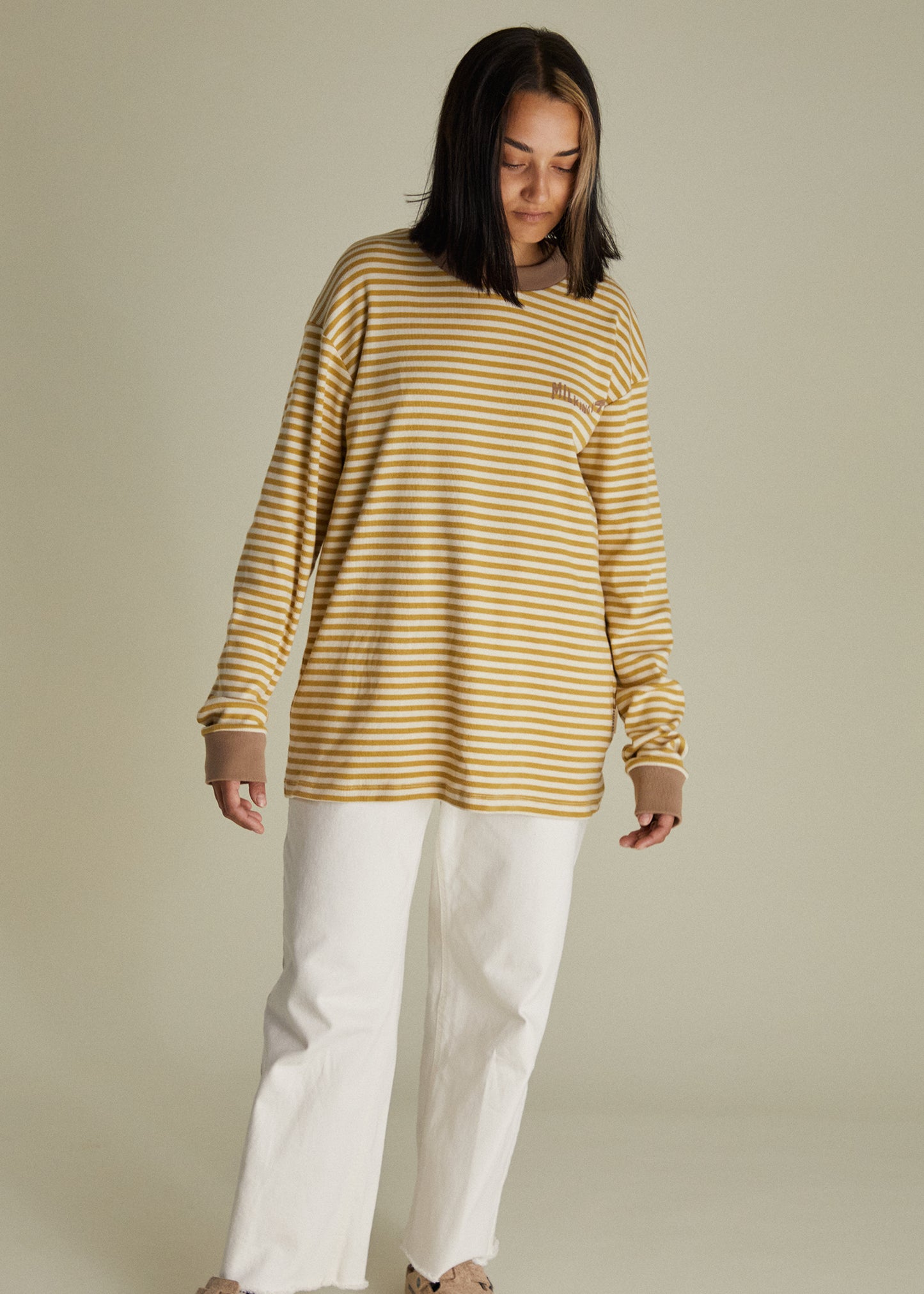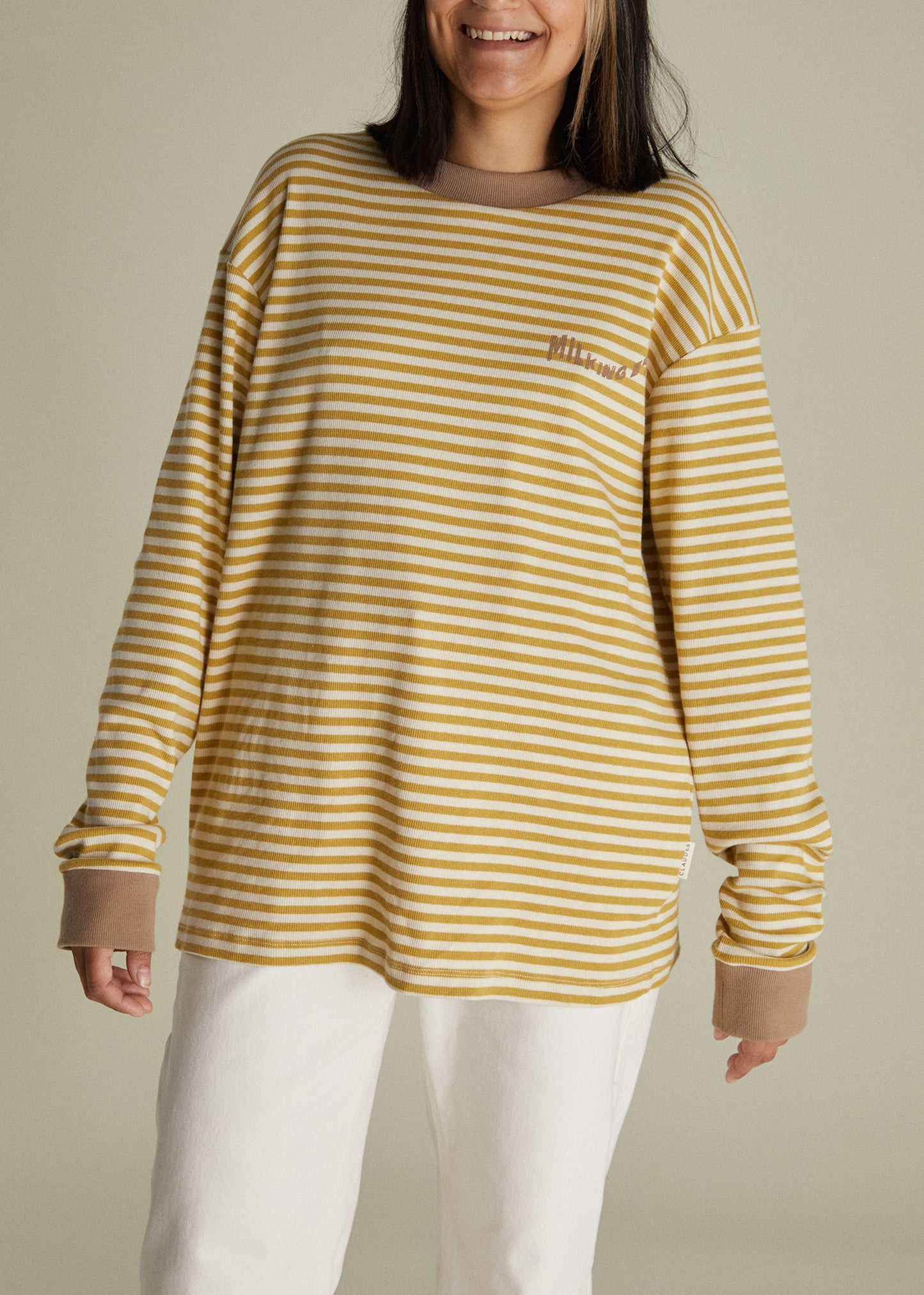 Introducing a fresh take on the best-selling design you loved, the Jamie striped long-sleeved t-shirt. Featuring a ribbed neck and wrist cuff detailing, with our signature Milking It wave front graphic, the Jamie Tee is designed with soft organic cotton in a beautiful horizontal cream and golden honey striped pattern.