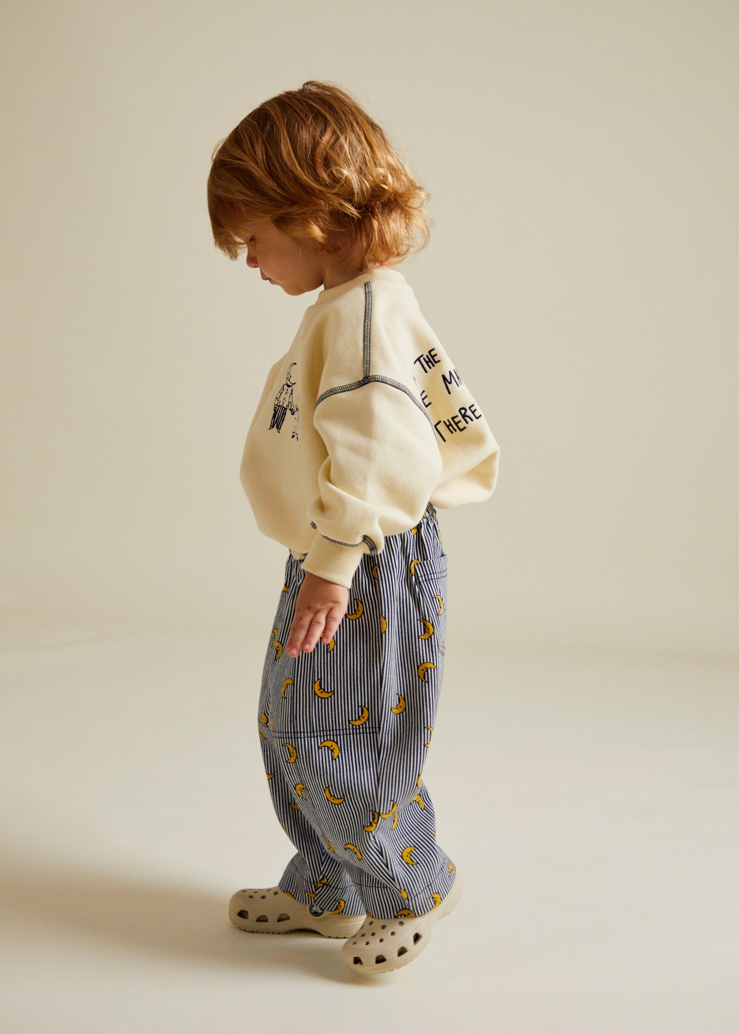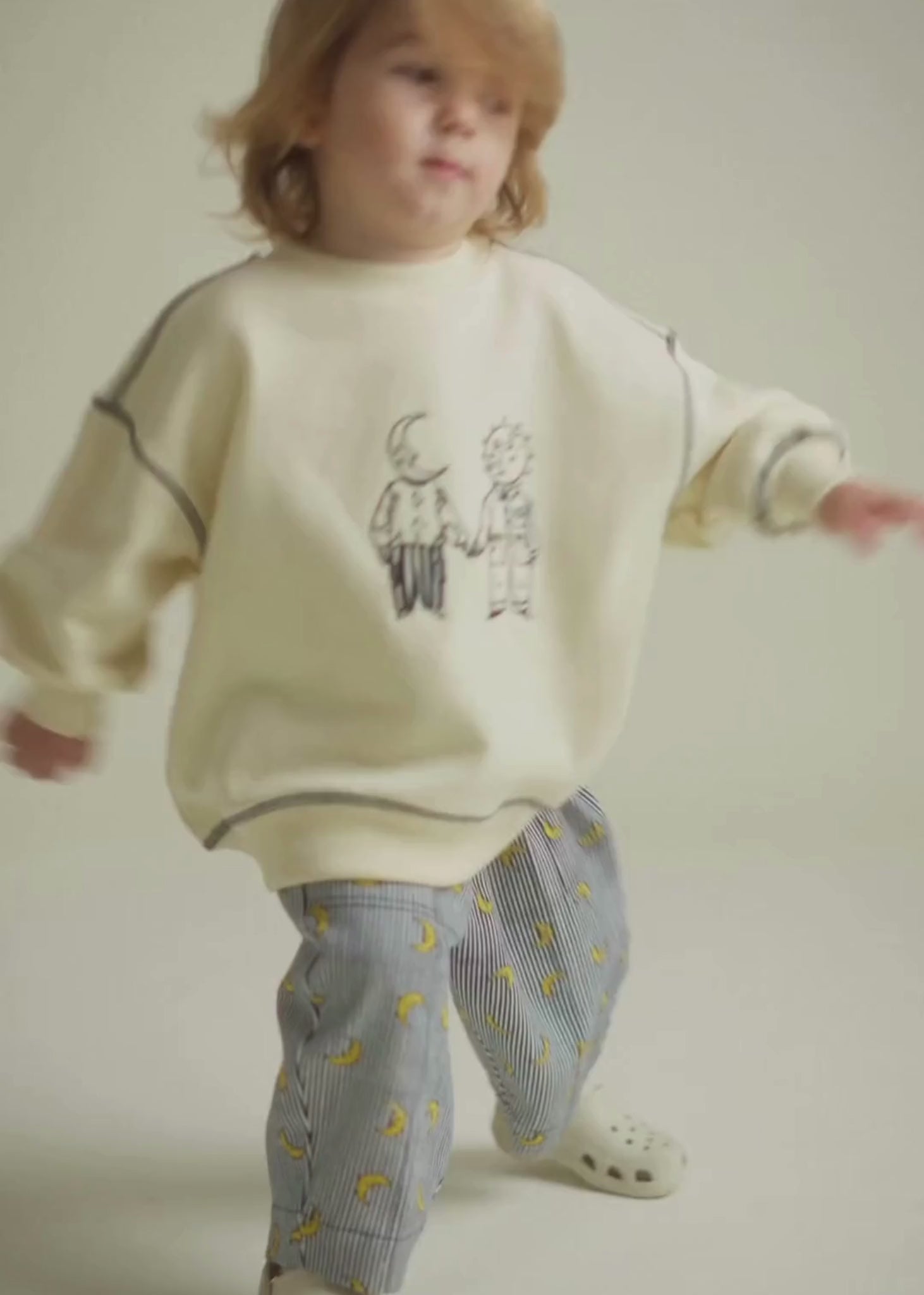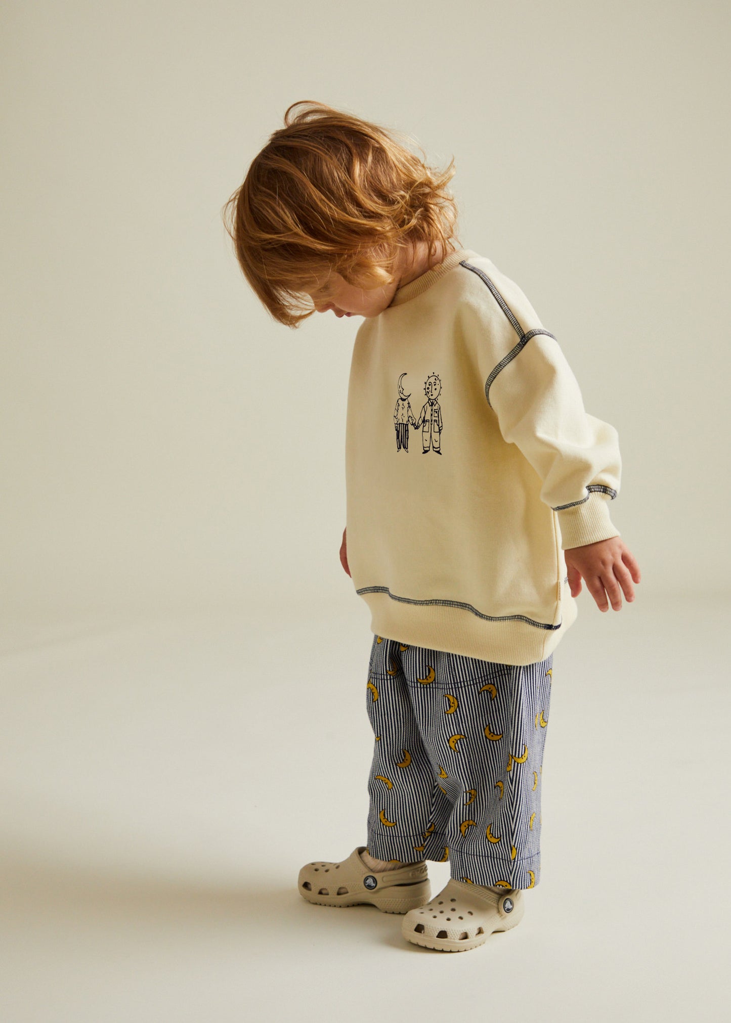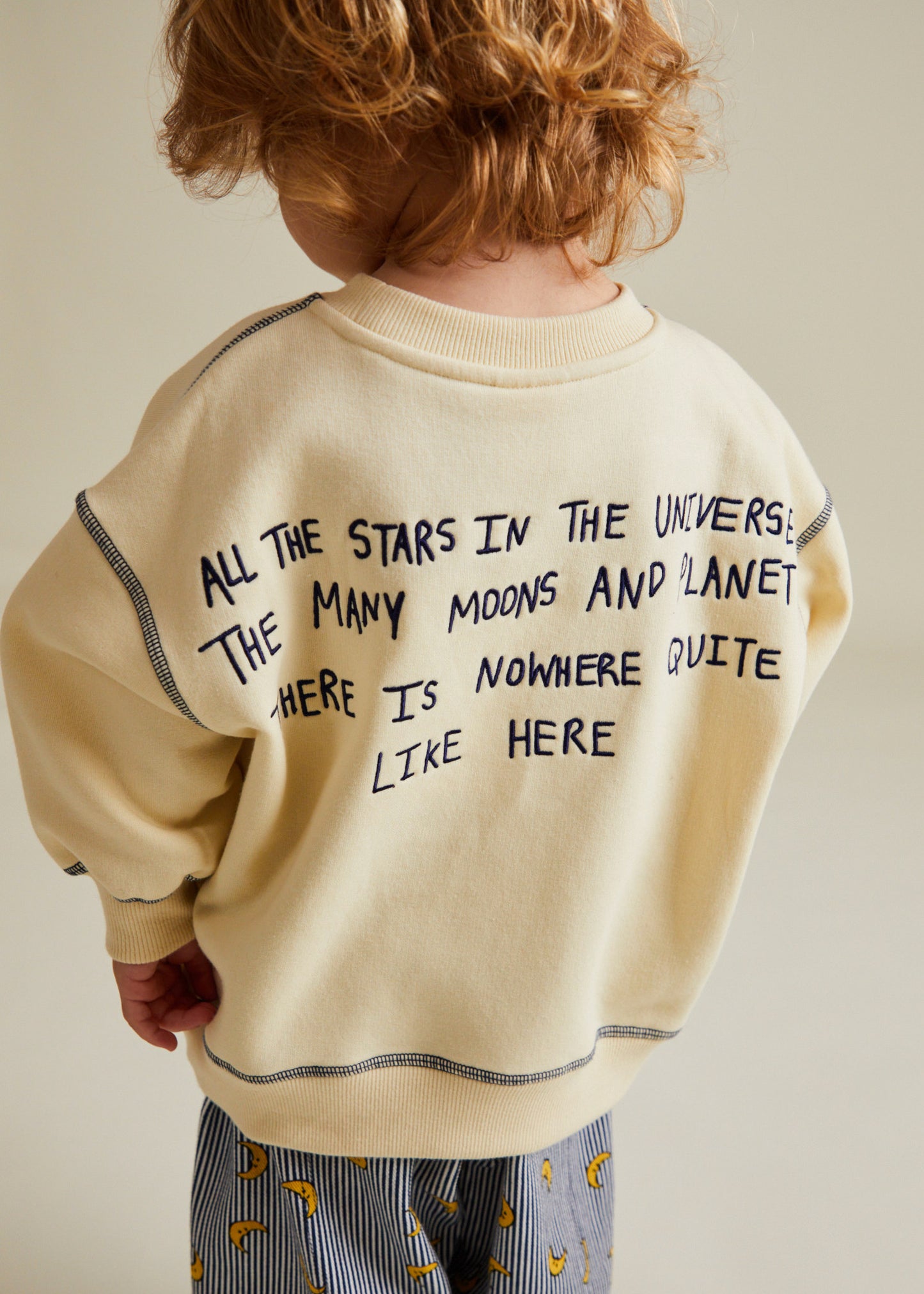 With it's oversized fit, soft neutral tone, and peachy brushed finish, it’s perfect for everyday wear. Featuring a small moon graphic on the front and a large embroidered universe story on the back, this piece brings storytelling to life - available in baby and children’s sizes for the perfect matching looks.