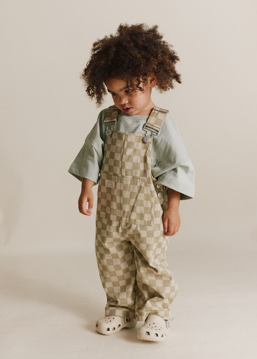 Checkerboard Dungaree Olive and Taupe - this must-have is a new take on a favourite. Expect the same slouchy, oversized fit that you know and love, crafted from 100% organic cotton twill, with a beautiful olive green and taupe grey checkerboard pattern. Incredibly comfortable and stylish, the straight silhouette and wide, turned-up legs make this design perfect for little ones on the go – featuring western-inspired contrast stitching and an oversized front pocket with our Claude & Co label that is the ideal shape for collecting treasures.