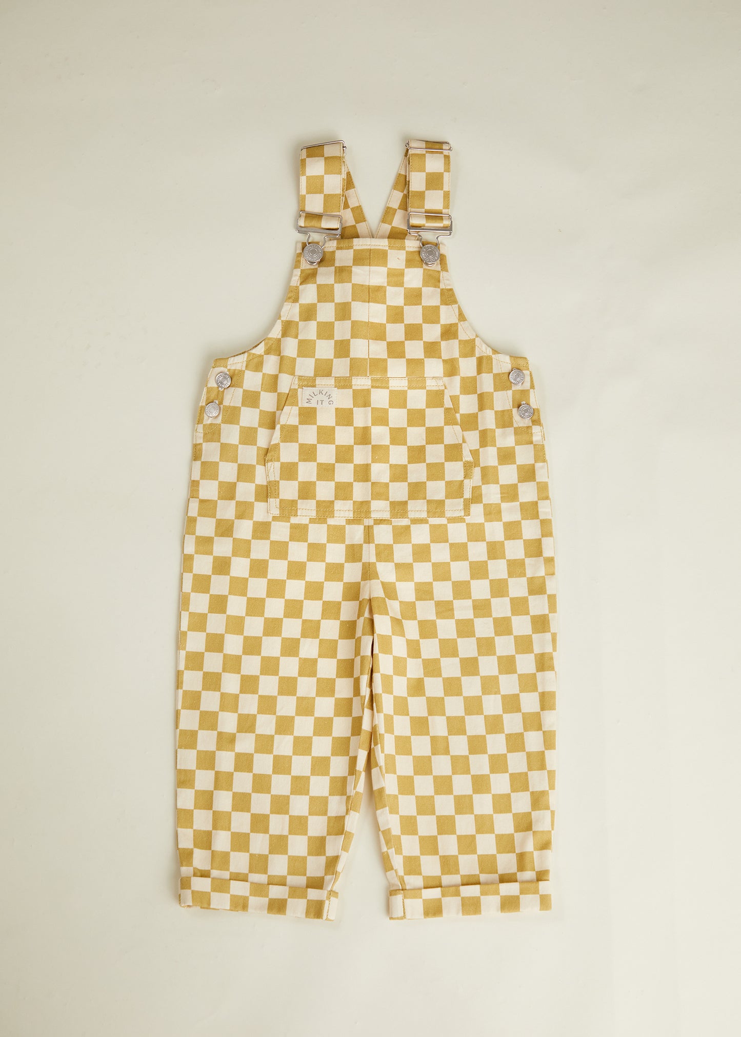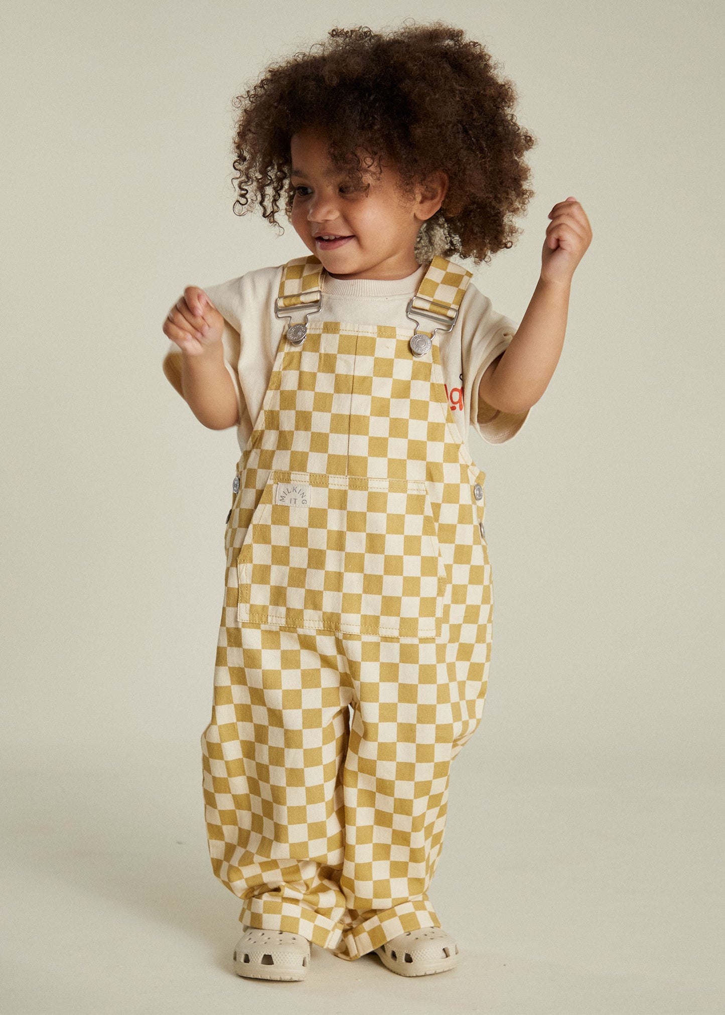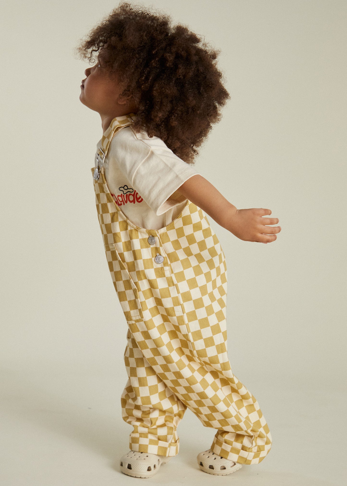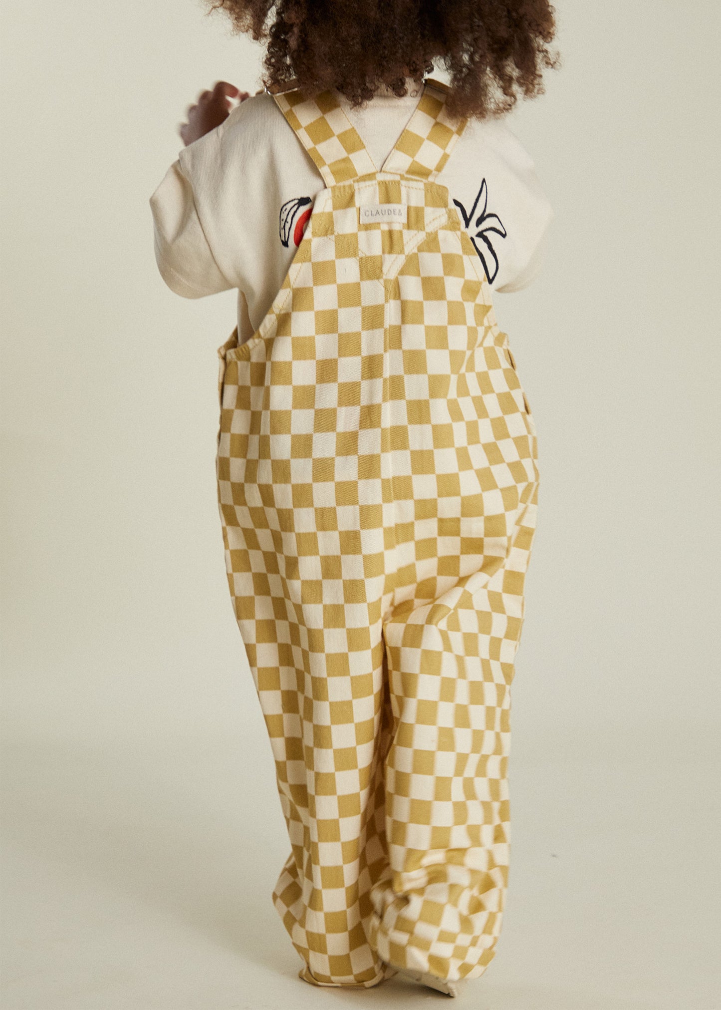 The ochre checkerboard dungarees from Claude & Co are a must-have. Each pair is made from 100% organic cotton and features a unique checkerboard print in ochre and cream. The straight fit and wide legs make them stylish and comfortable. The dungaree also has buckle fastenings and adjustable straps, so you can customize the fit to your liking. We suggest purchasing your true size, but if you prefer a rolled leg look, go one size up. Our models are wearing size 2-3Y and it fits perfectly in that range.