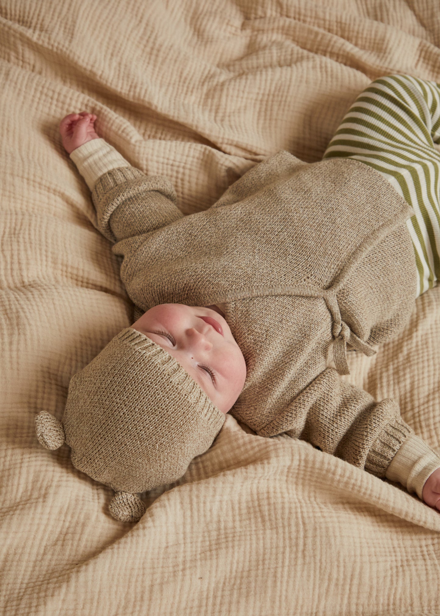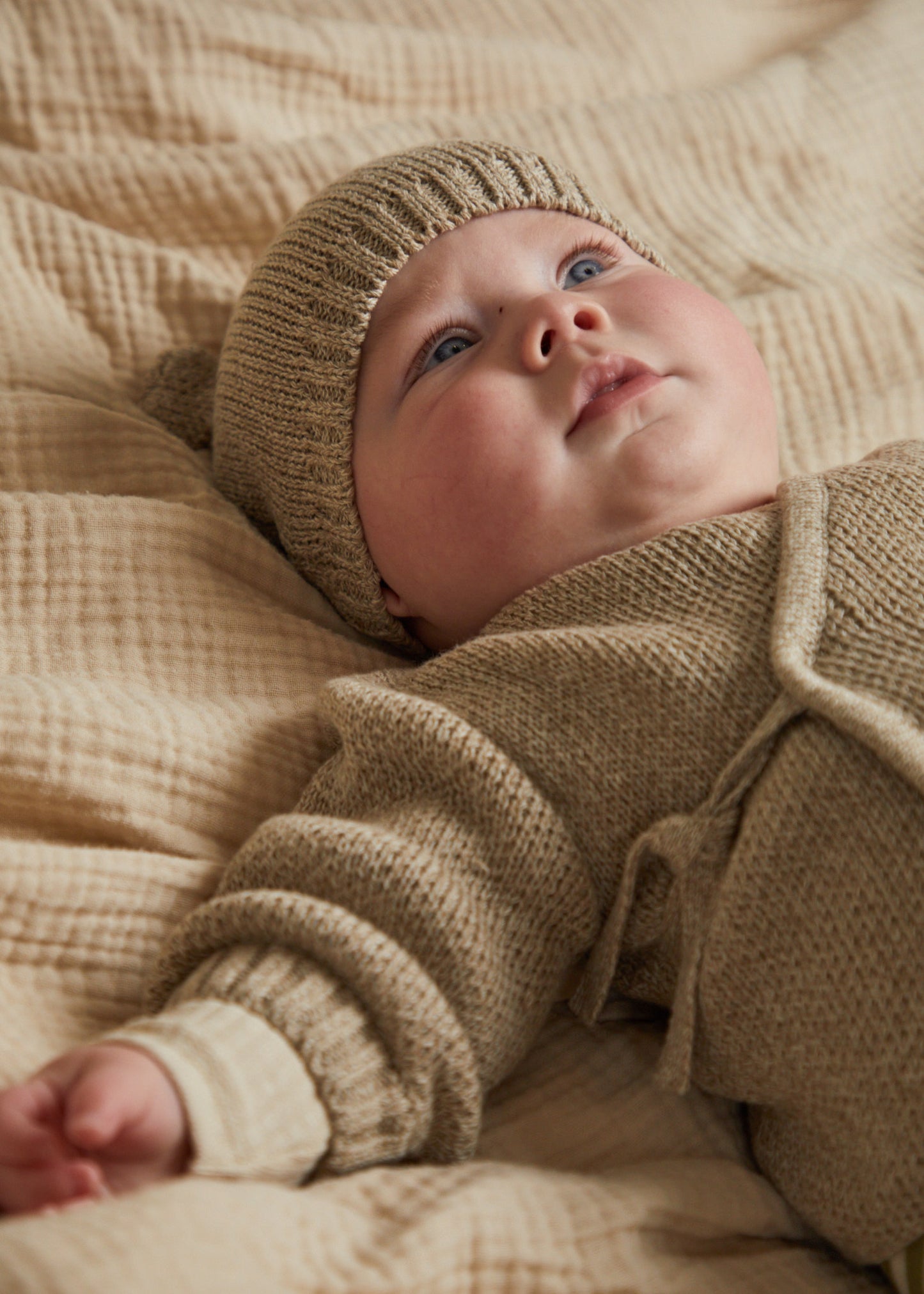 In a gentle oat shade, the Hampton set is completed with a matching hat in twisted yarn, finished with charming ear details. A thoughtful knitwear duo that makes a beautiful gift, while pairing perfectly with our baby leggings for a cosy, coordinated outfit.