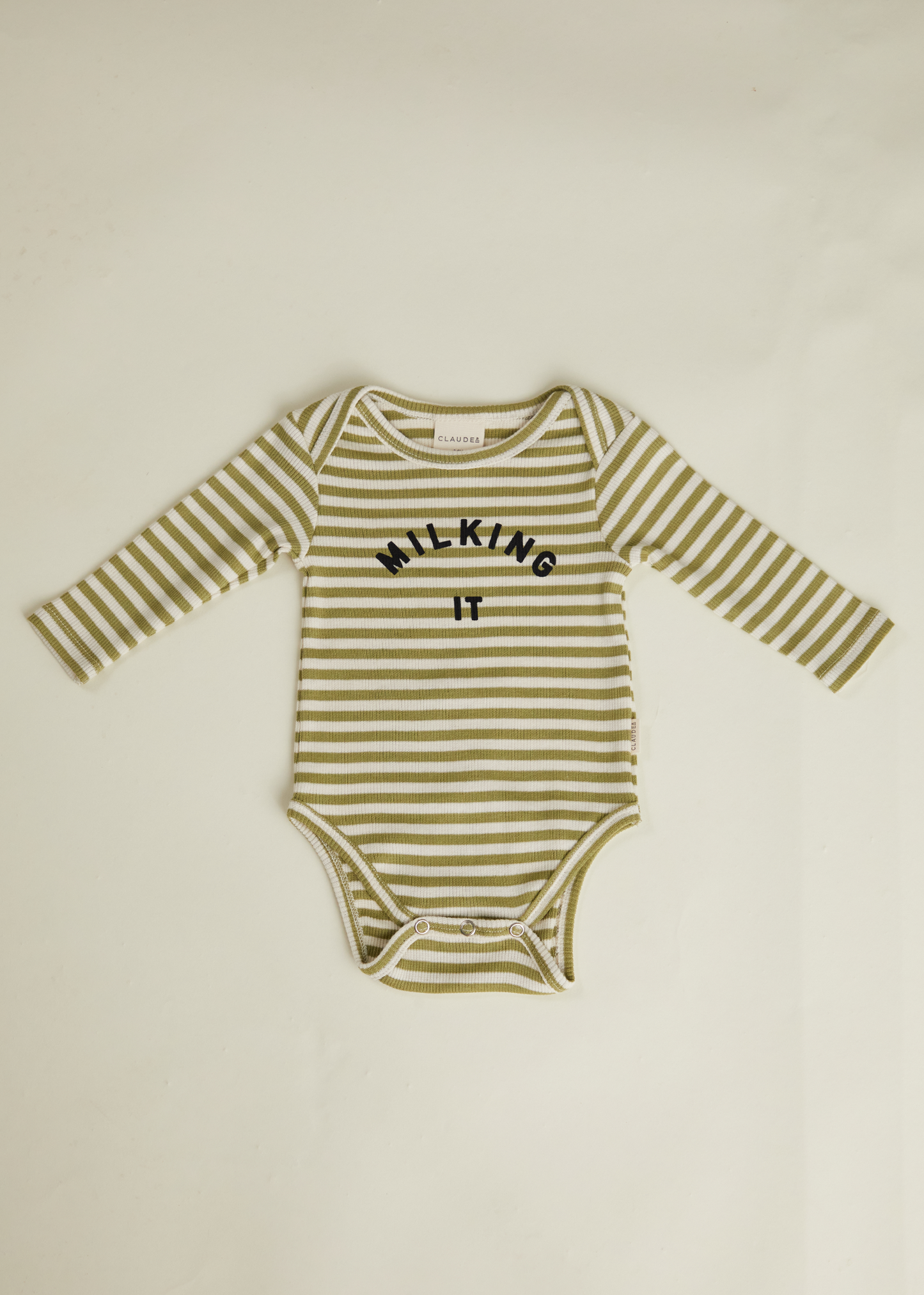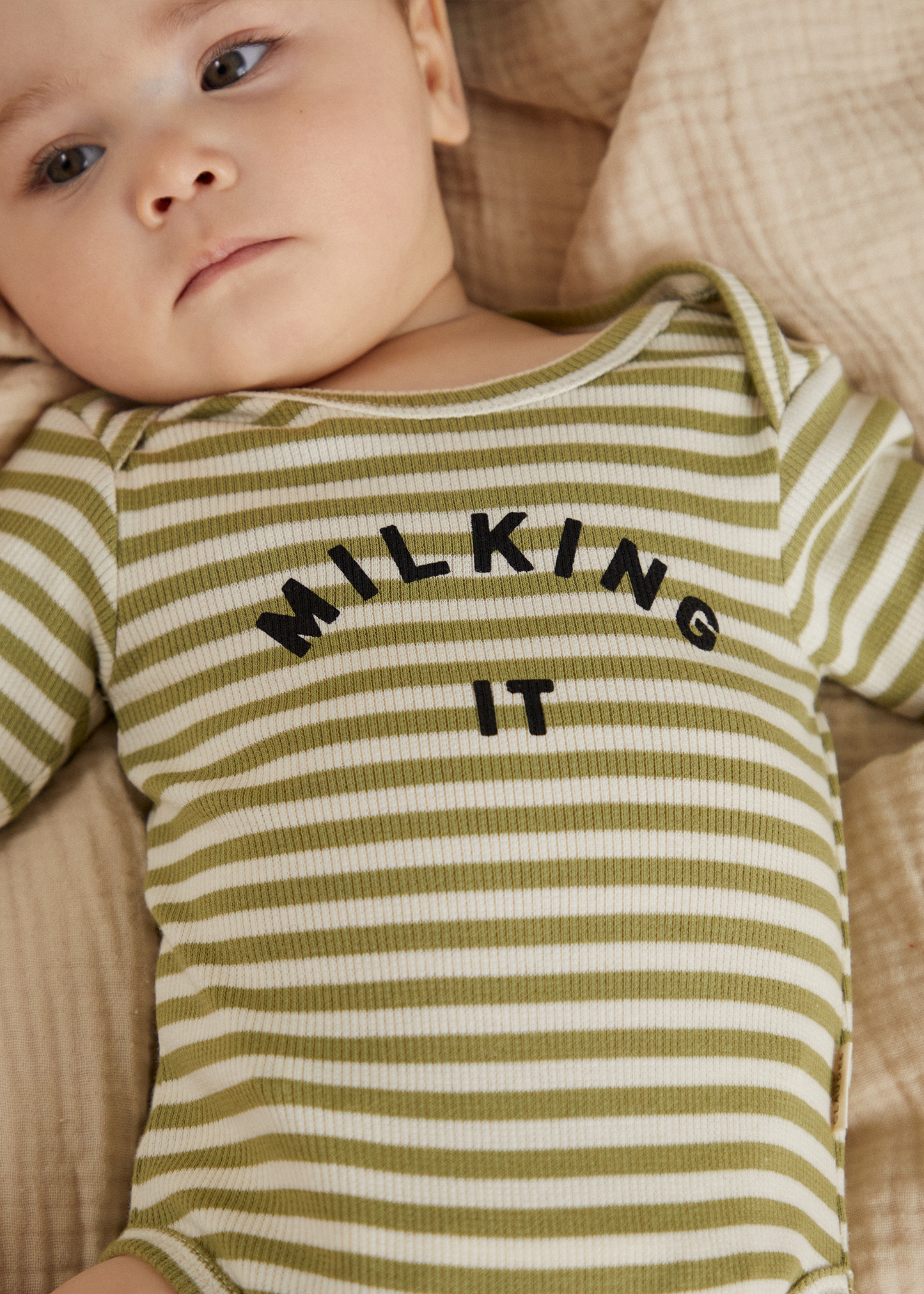Fresh sage stripe with our signature touch. Soft organic rib, easy recovery, finished with a charcoal Milking It print. Envelope neck and crotch poppers keep dressing simple. True to size. 97% organic cotton, 3% elastane. Made in Portugal. Unisex.