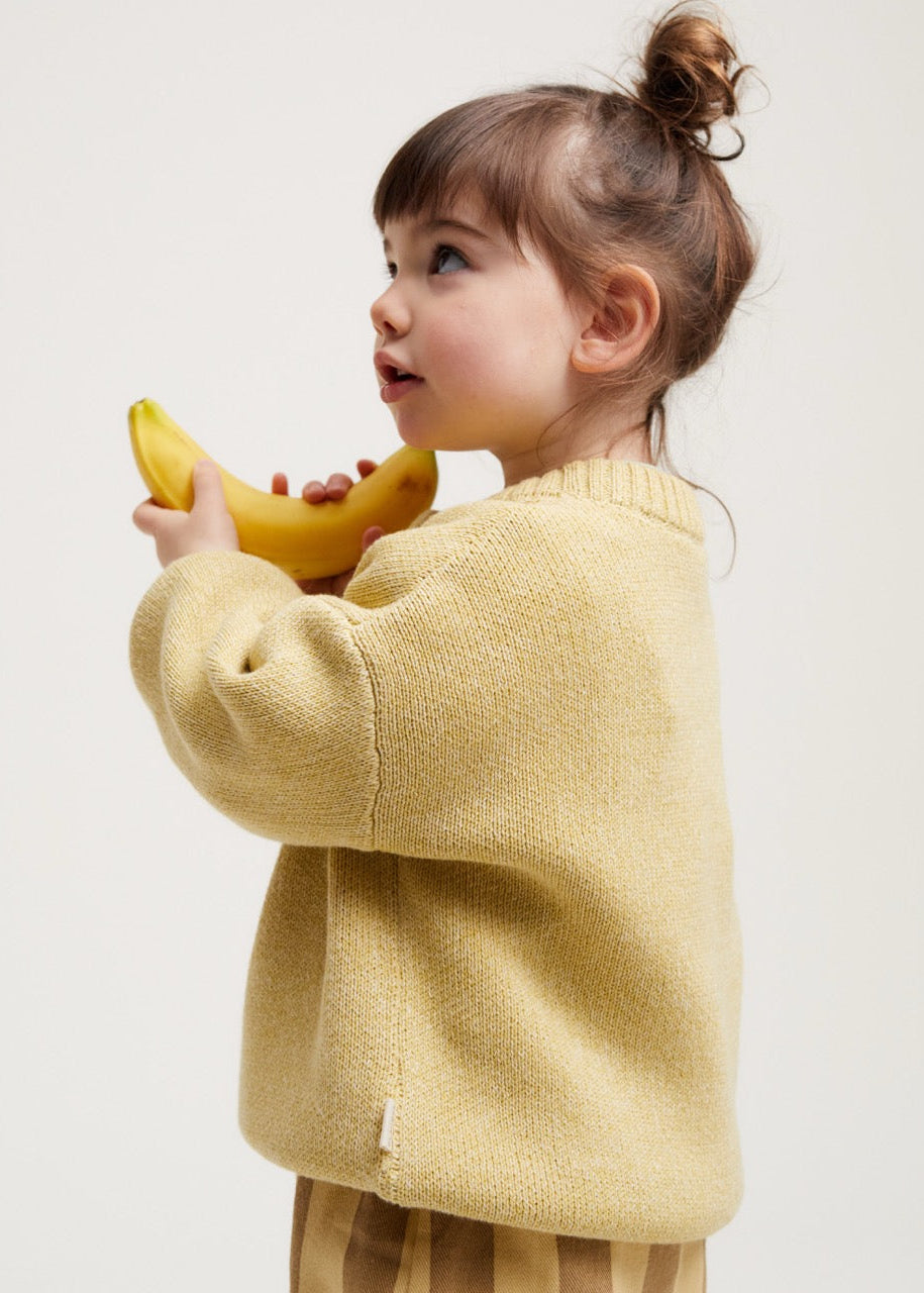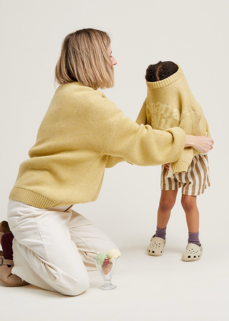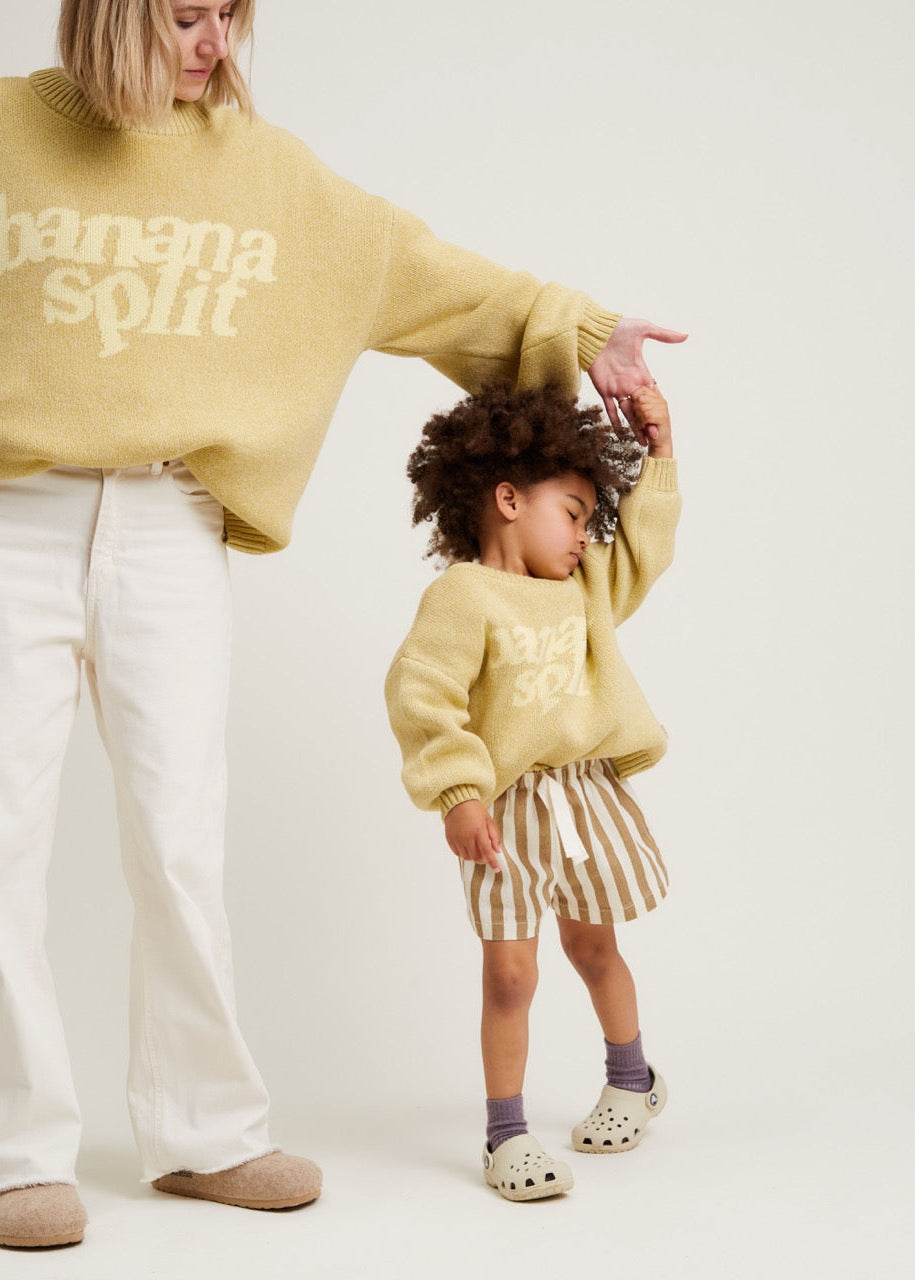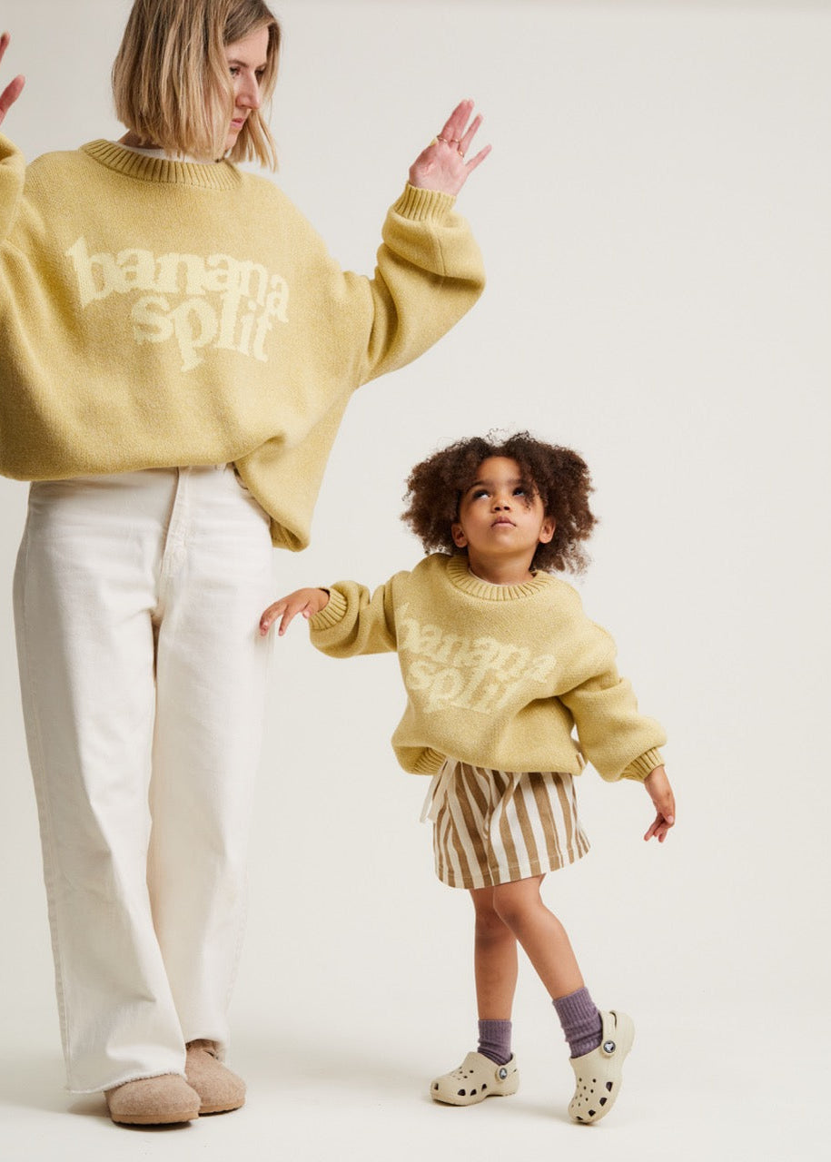 The Lori Banana sweater. Made from 100% organic cotton. This unisex knitted jumper has a banana yellow base with 'Banana Split' knitted into the front in a lighter contrast shade. With the same oversized, slouchy fit that you’ve come to love from us, featuring balloon-shaped cuff sleeves, dropped shoulders and ribbed cuffs on the hem, wrists and neckline.