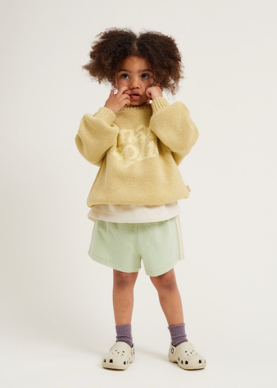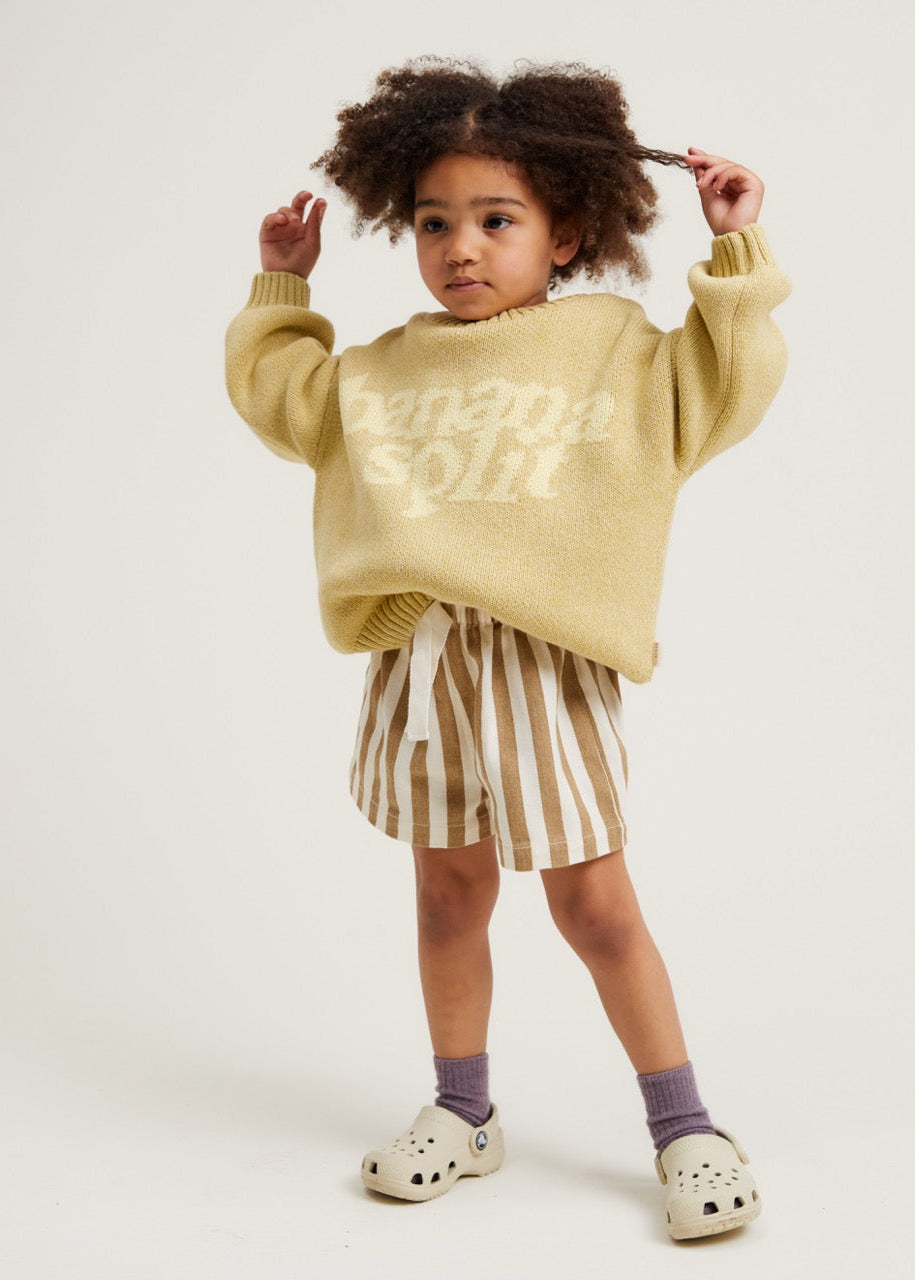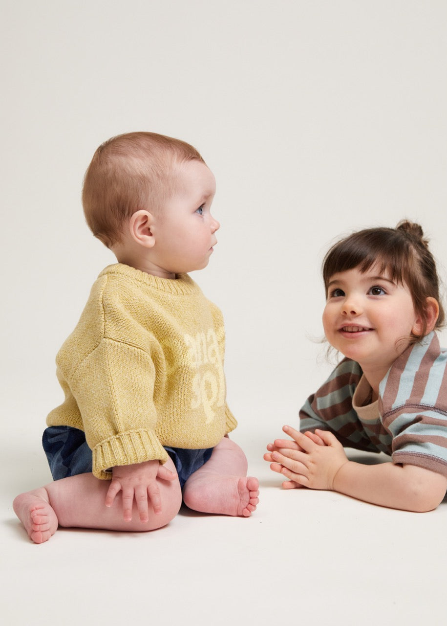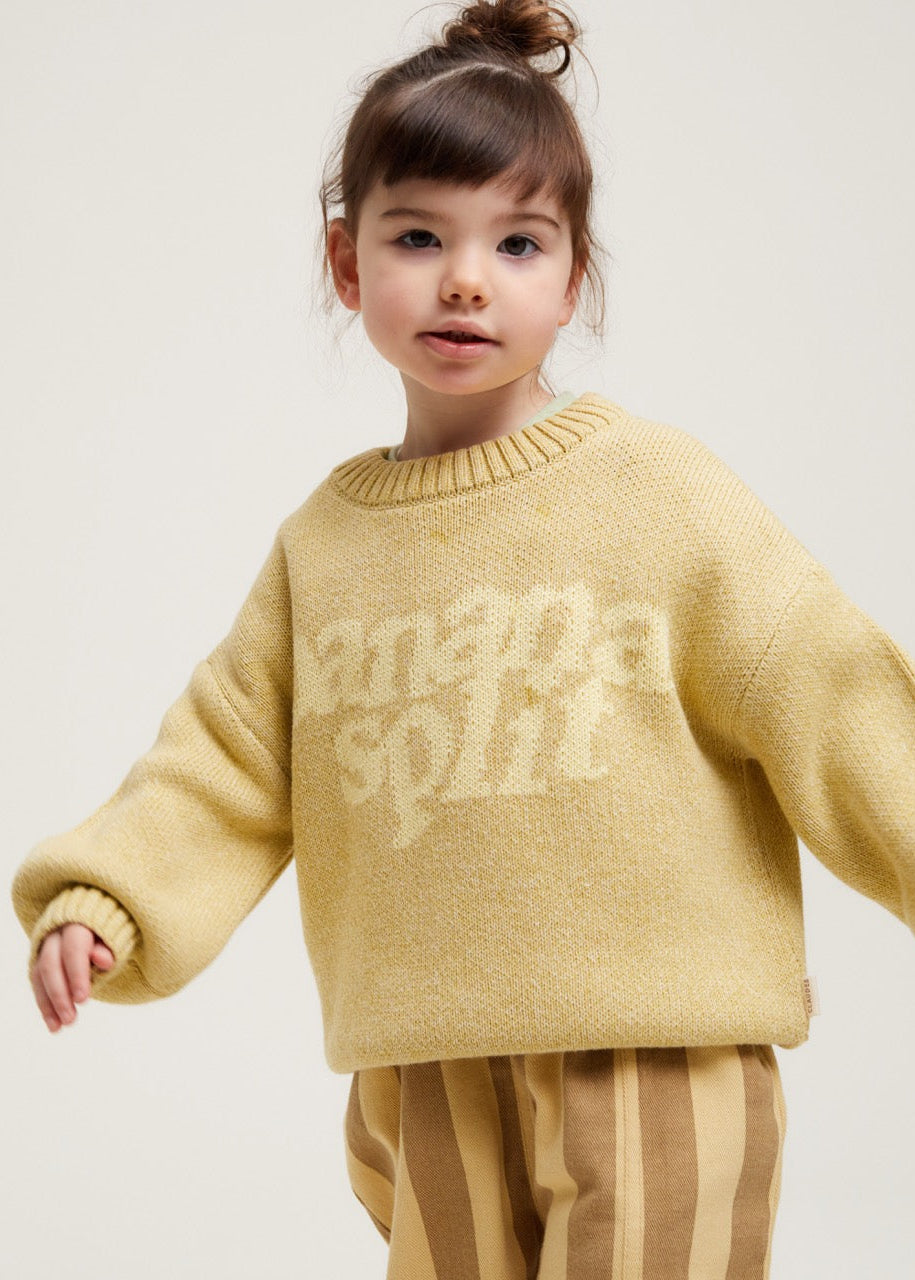 The Lori Banana sweater. Made from 100% organic cotton. This unisex knitted jumper has a banana yellow base with 'Banana Split' knitted into the front in a lighter contrast shade. With the same oversized, slouchy fit that you’ve come to love from us, featuring balloon-shaped cuff sleeves, dropped shoulders and ribbed cuffs on the hem, wrists and neckline.