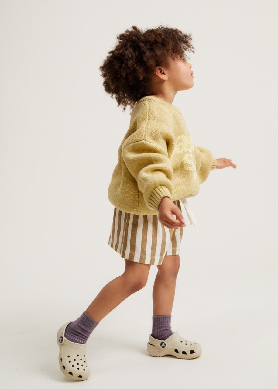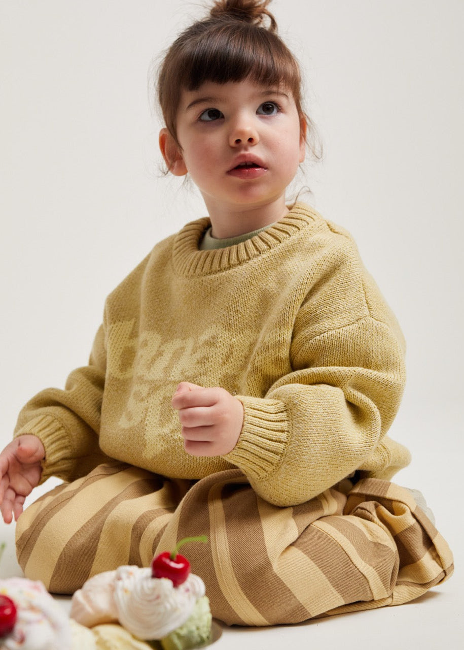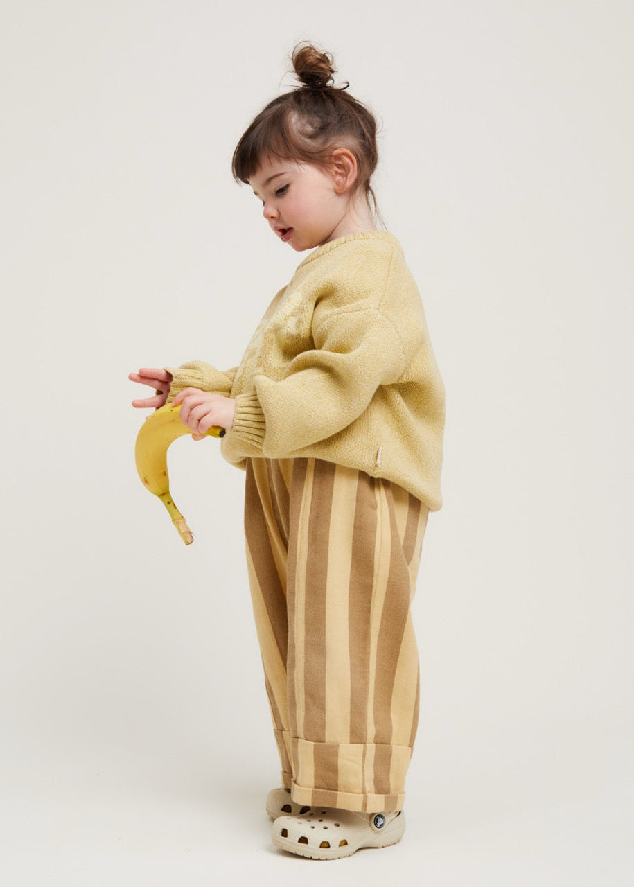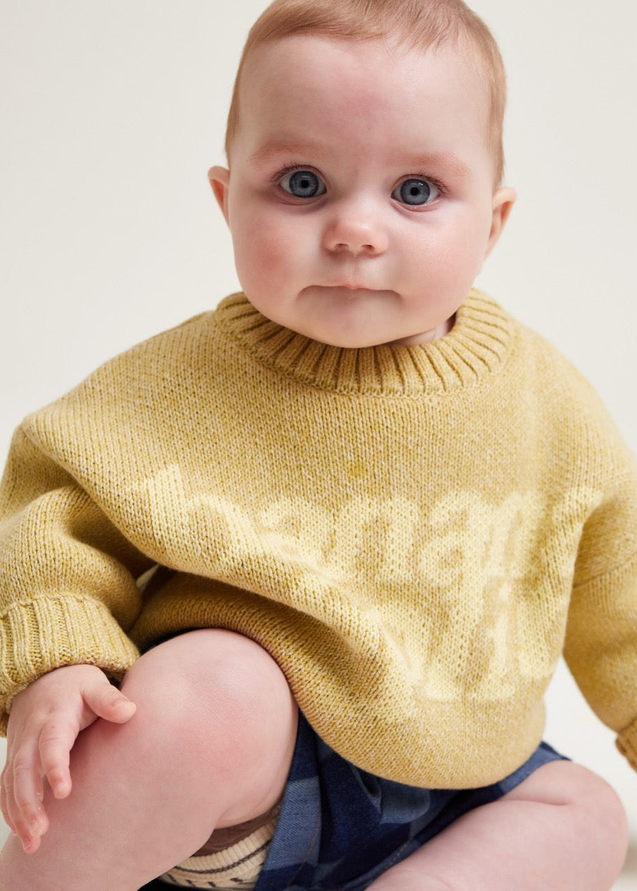 The Lori Banana sweater. Made from 100% organic cotton. This unisex knitted jumper has a banana yellow base with 'Banana Split' knitted into the front in a lighter contrast shade. With the same oversized, slouchy fit that you’ve come to love from us, featuring balloon-shaped cuff sleeves, dropped shoulders and ribbed cuffs on the hem, wrists and neckline.