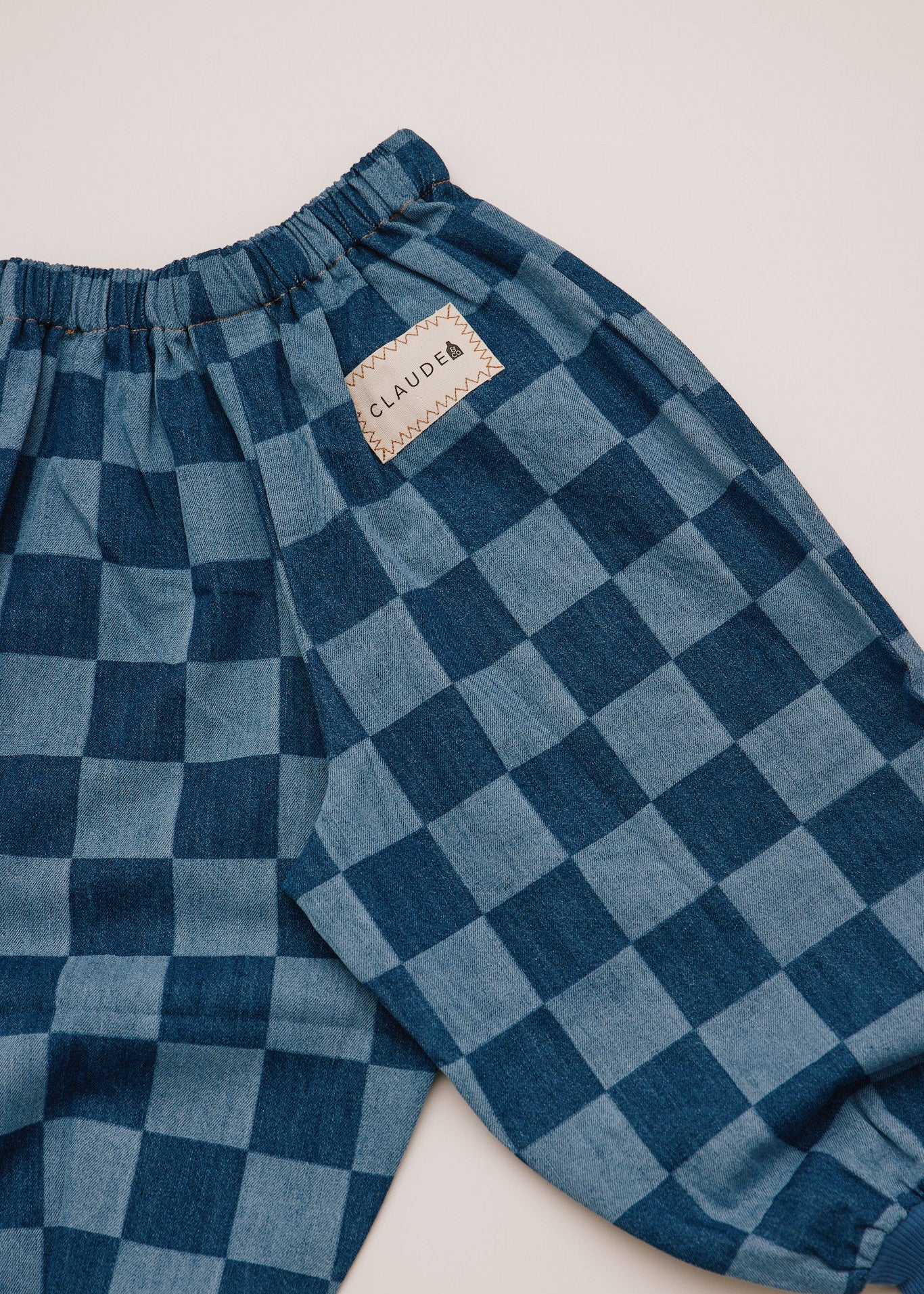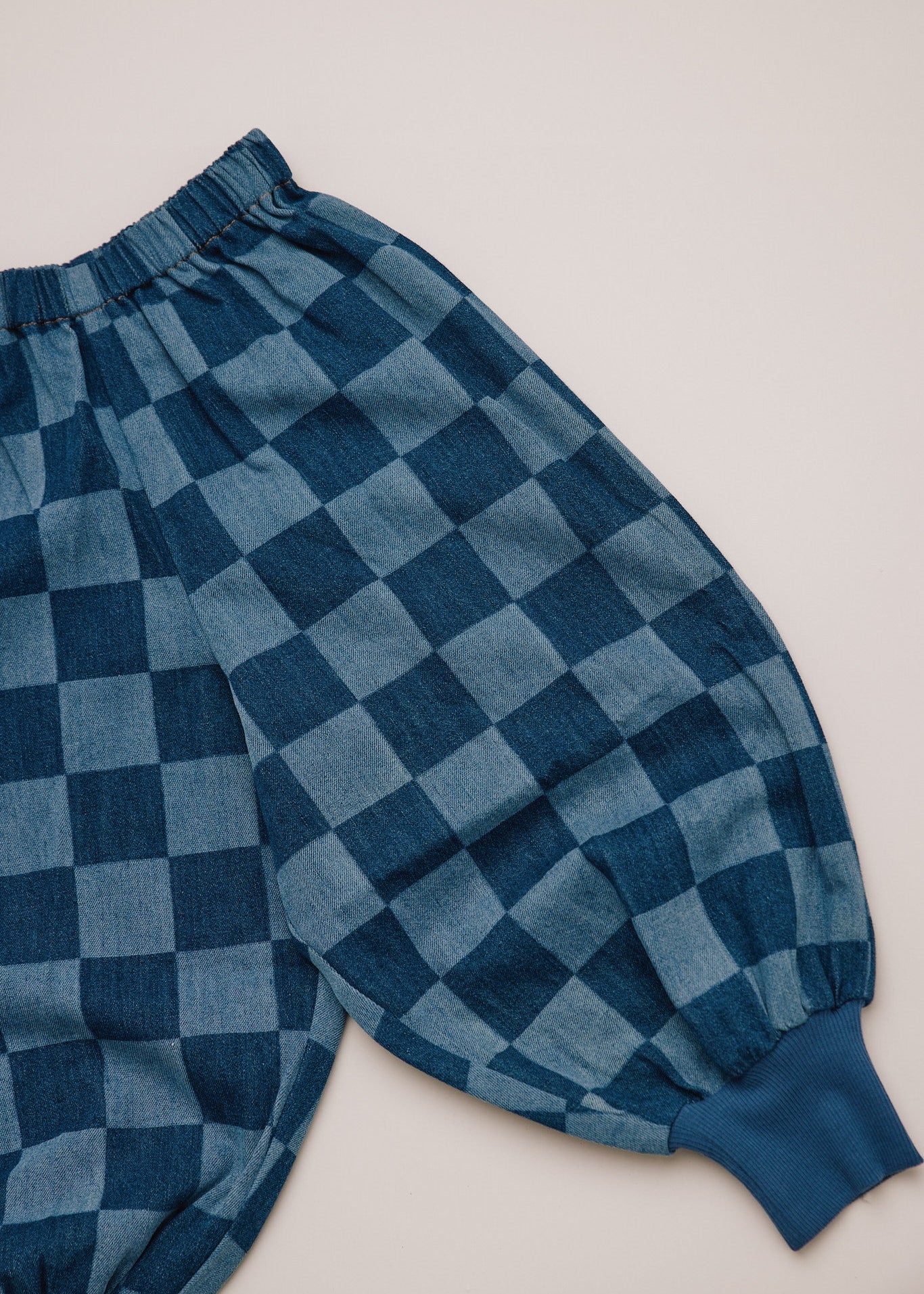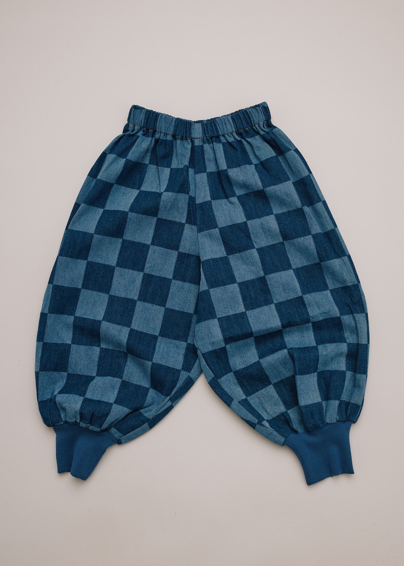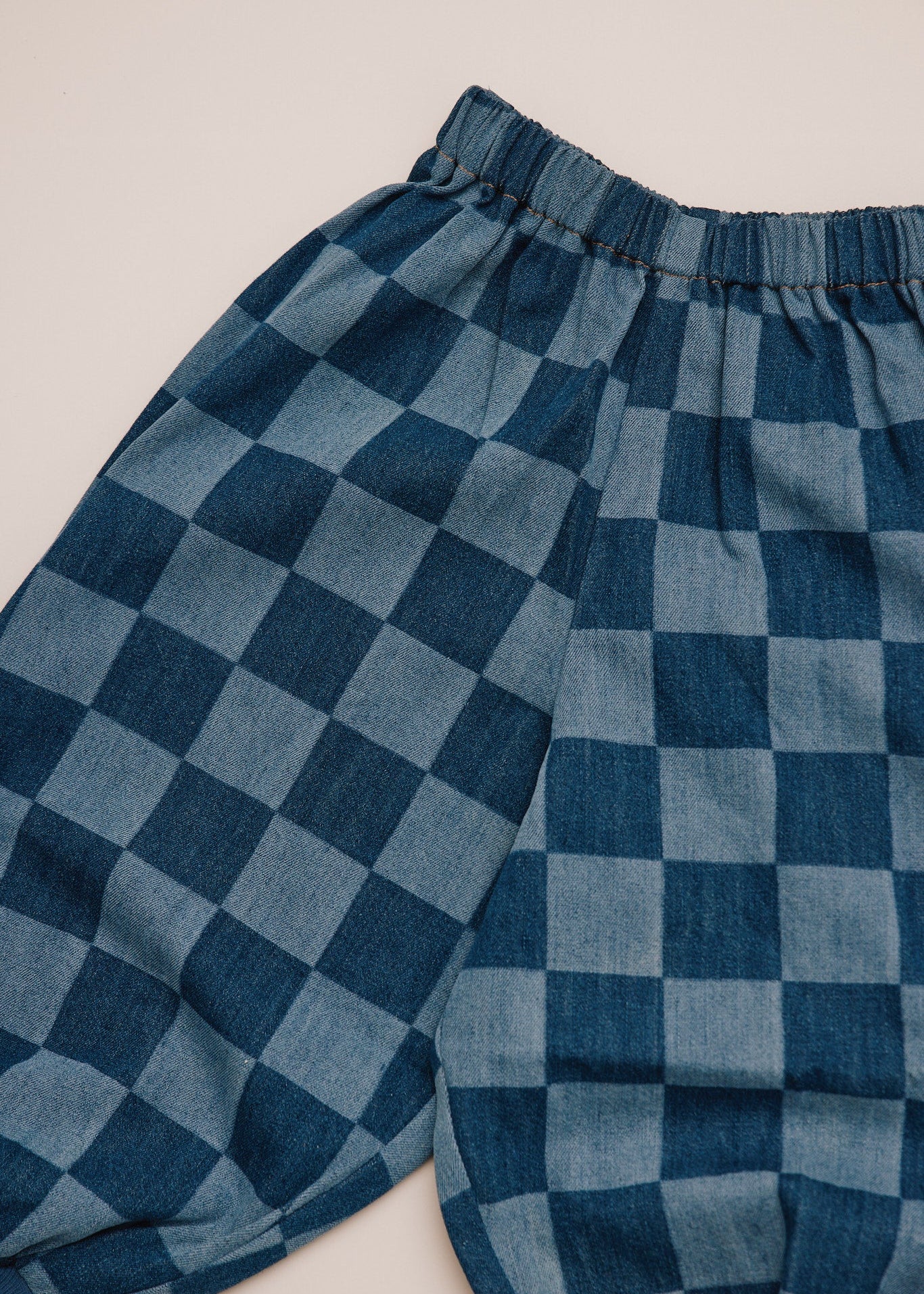 Introducing the Murphy trousers. Crafted from light blue washed denim twill these unisex lightweight trousers feature an indigo blue checkerboard pattern. Similar to our Emerson shape they are cut with an oversized, slouchy fit and feature elasticated cuffed hems, to create a tapered balloon leg.
