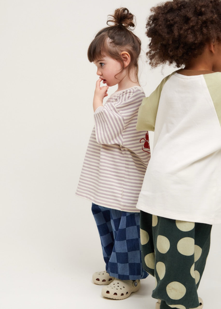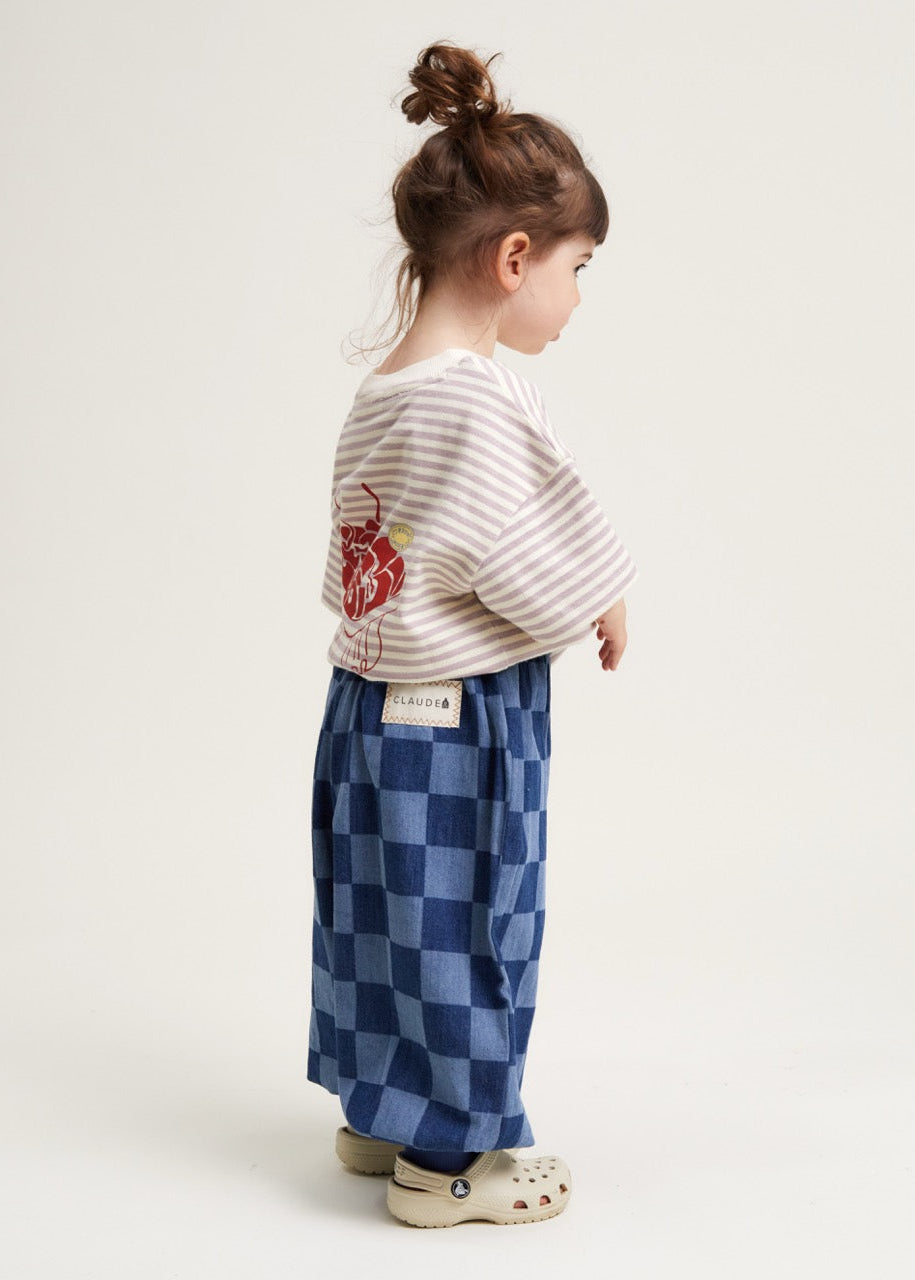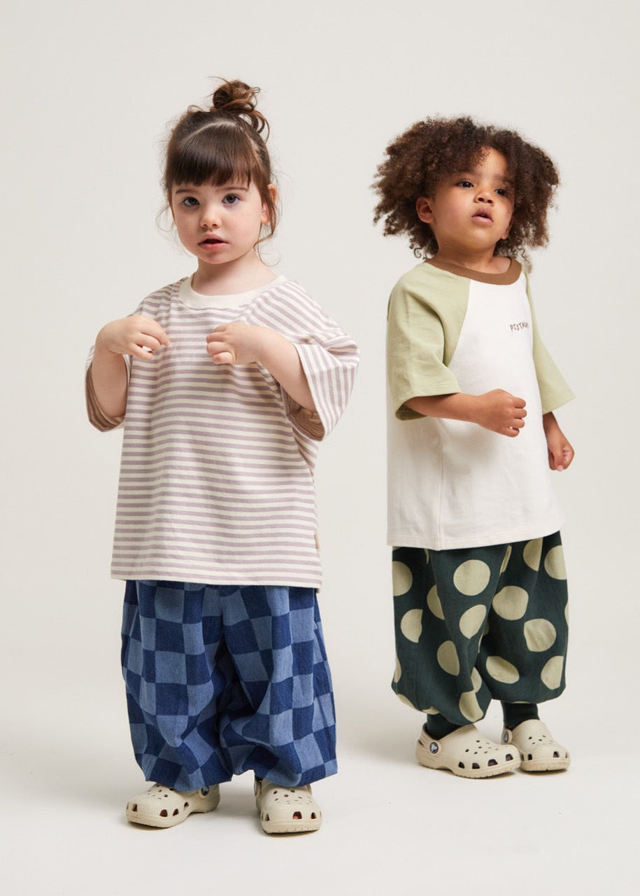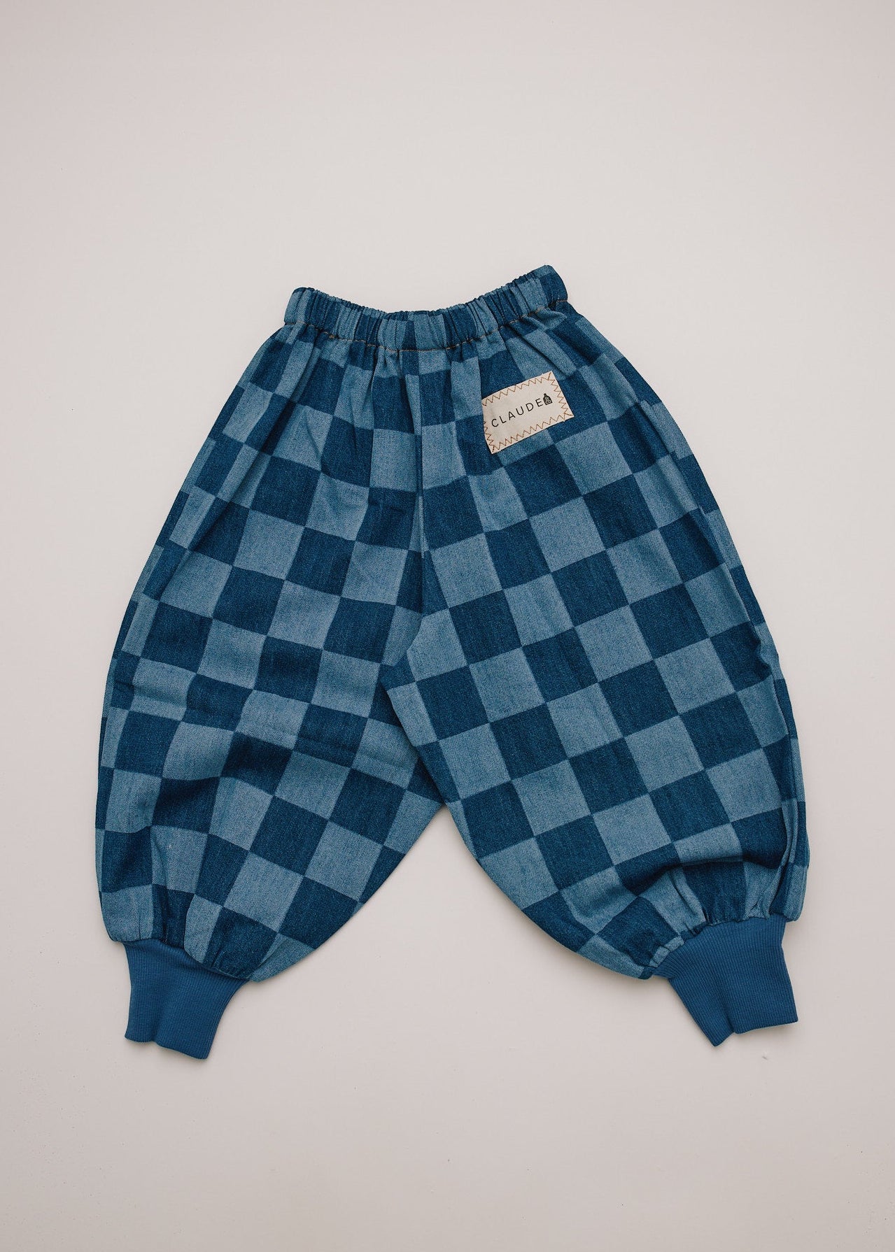 Introducing the Murphy trousers. Crafted from light blue washed denim twill these unisex lightweight trousers feature an indigo blue checkerboard pattern. Similar to our Emerson shape they are cut with an oversized, slouchy fit and feature elasticated cuffed hems, to create a tapered balloon leg.