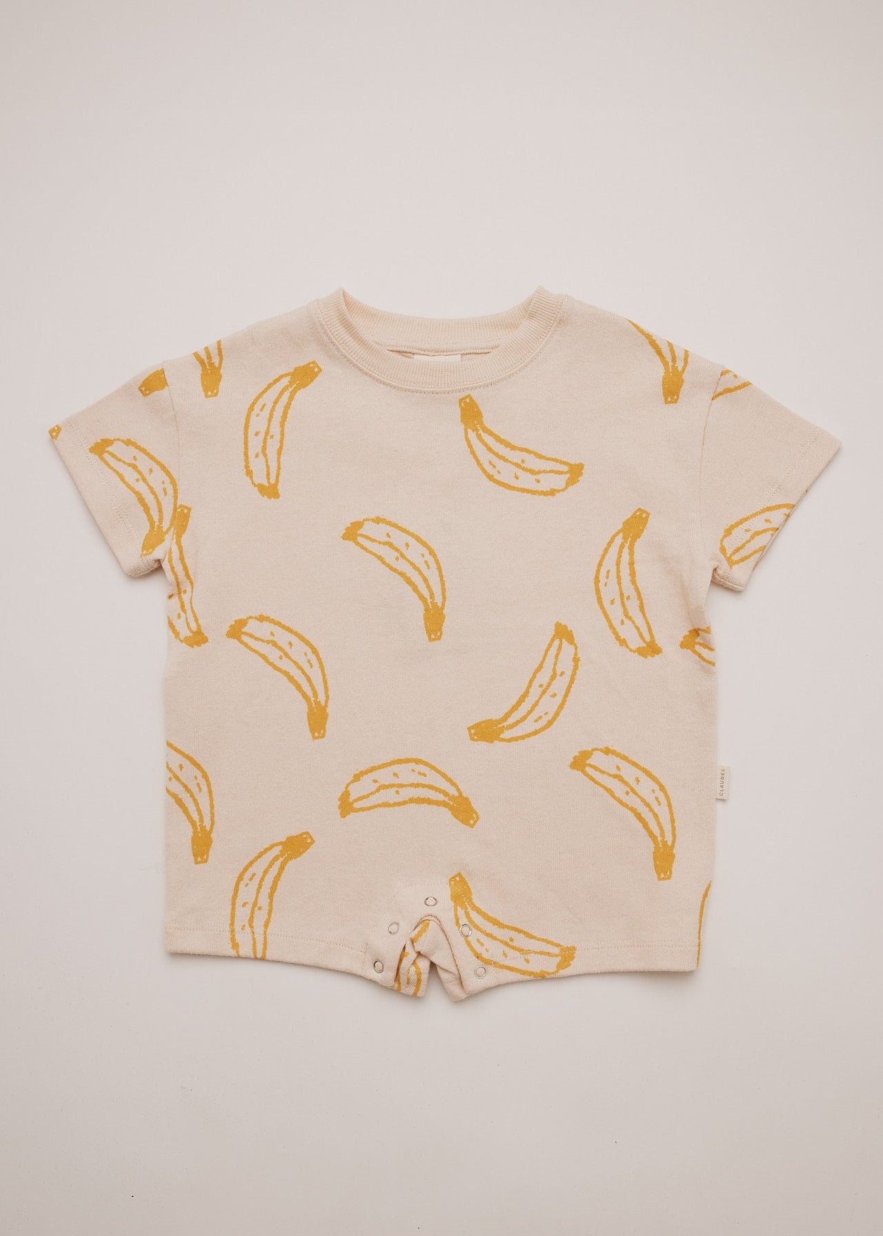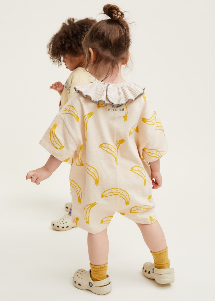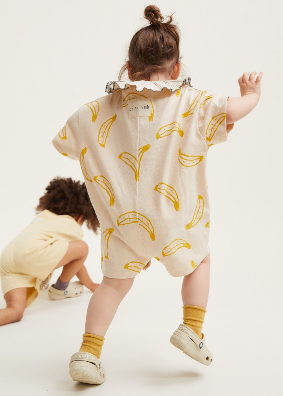 The Opal unisex kids romper in neutral cream. Featuring an all-over banana print pattern in honey yellow. Made from 100% soft organic cotton, this silhouette has a dropped shoulder and oversized, slouchy shape. Finished with branded 'Claude' label on the reverse and popper fastening.