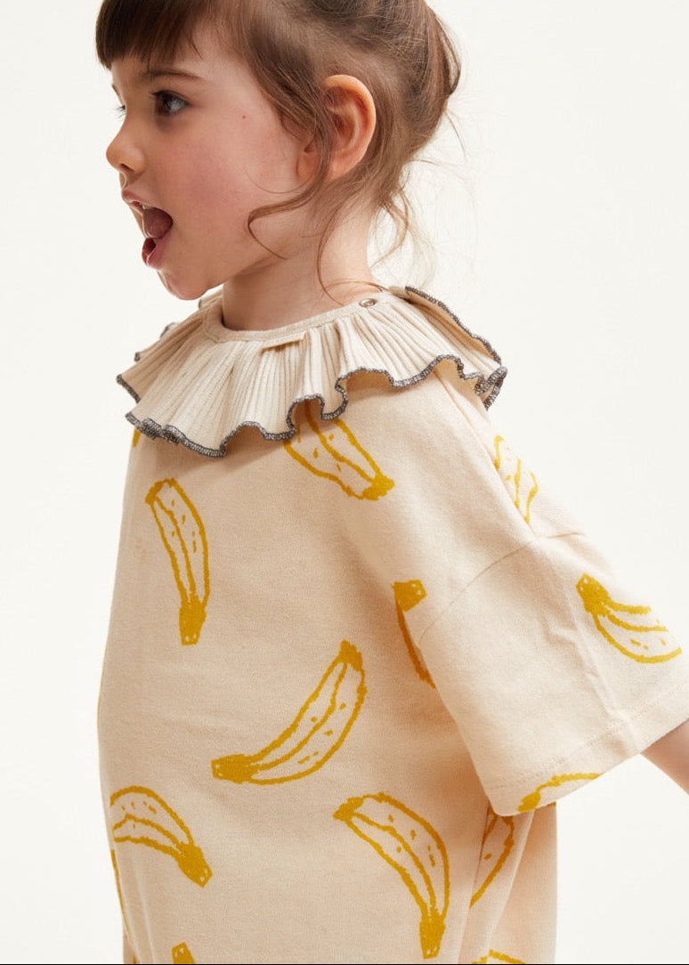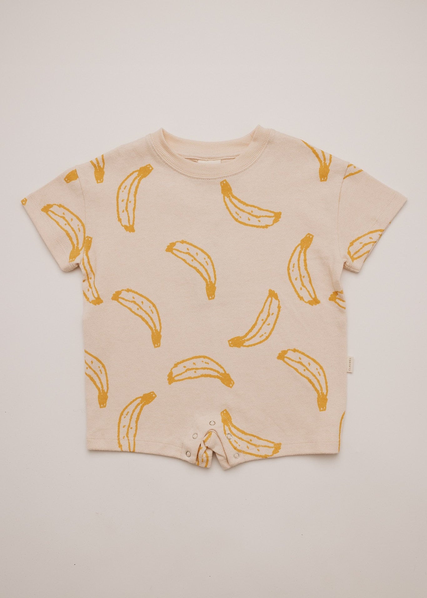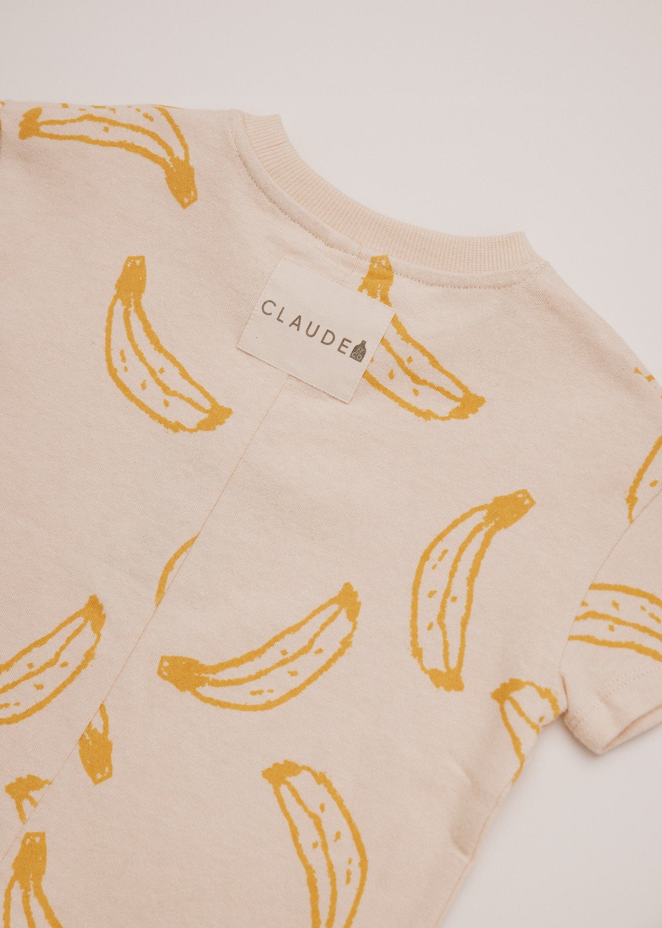 The Opal unisex kids romper in neutral cream. Featuring an all-over banana print pattern in honey yellow. Made from 100% soft organic cotton, this silhouette has a dropped shoulder and oversized, slouchy shape. Finished with branded 'Claude' label on the reverse and popper fastening.