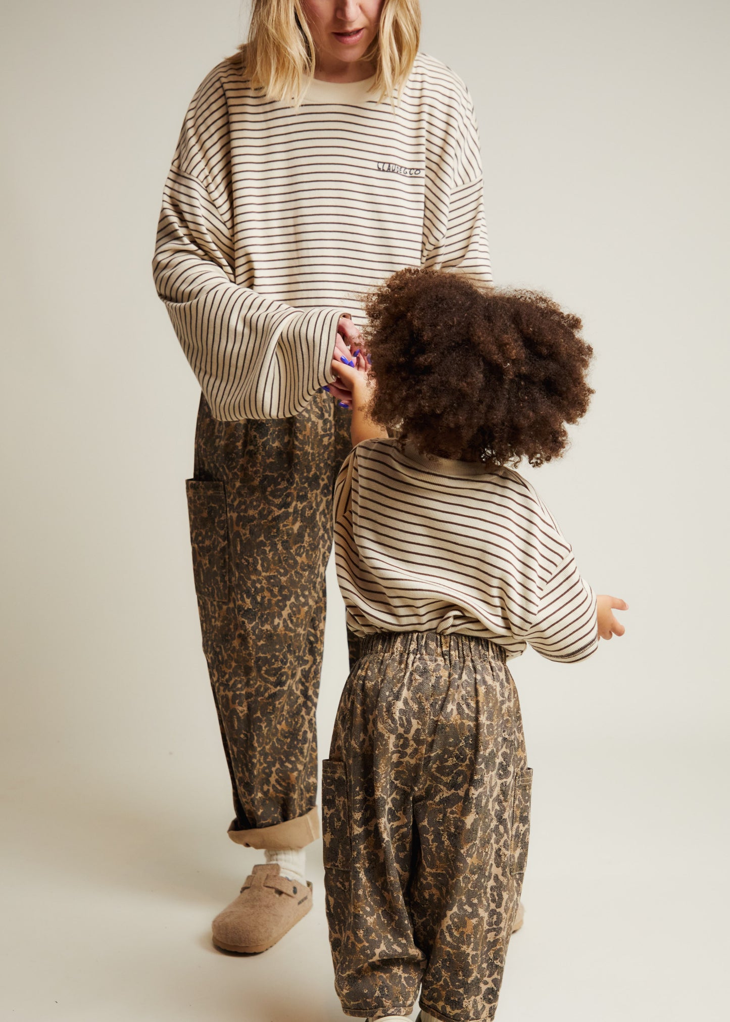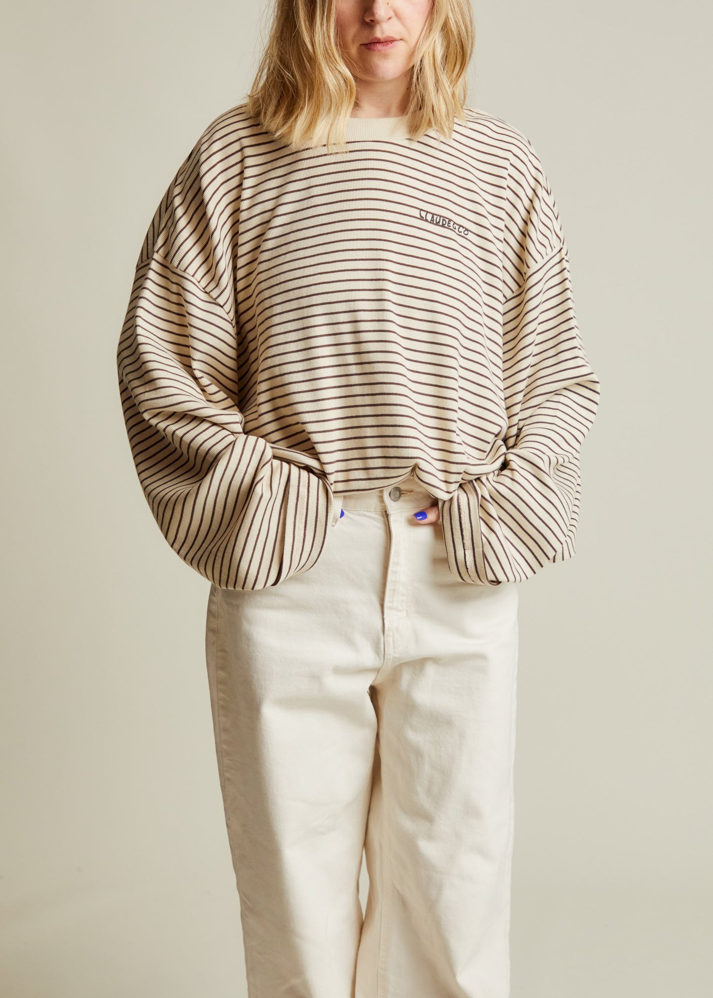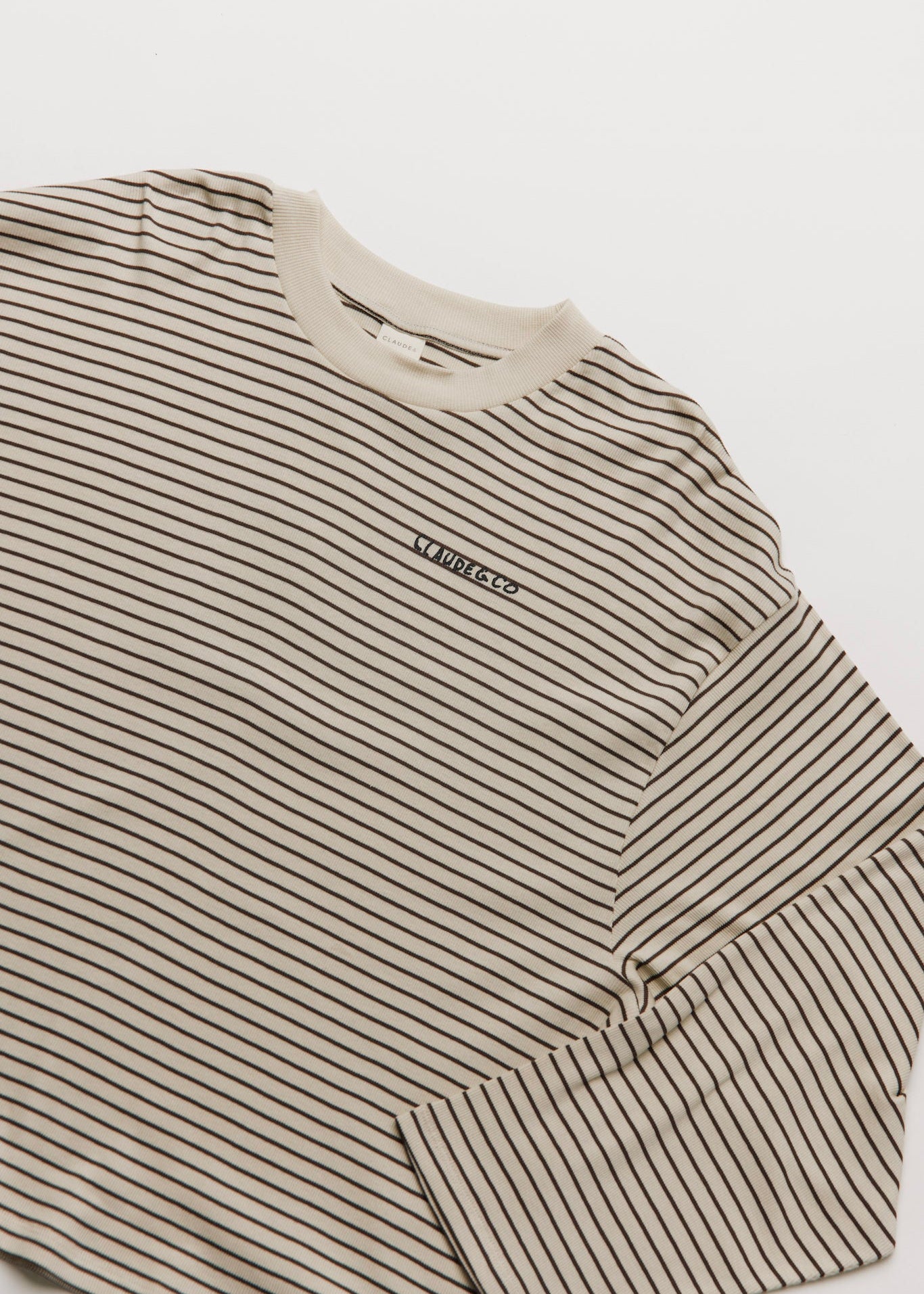 The Lenni longsleeve tee returns in our signature oat rib knit with a classic coco stripe print. Crafted from 100% soft organic cotton. Cut in an oversized, boxy silhouette. Finished with ‘Claude & Co’ logo printed on the chest in charcoal.