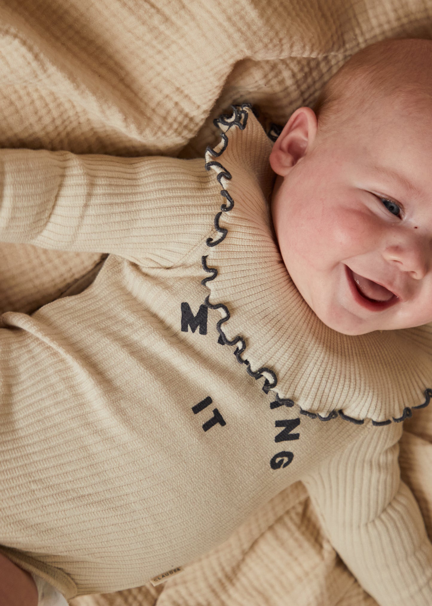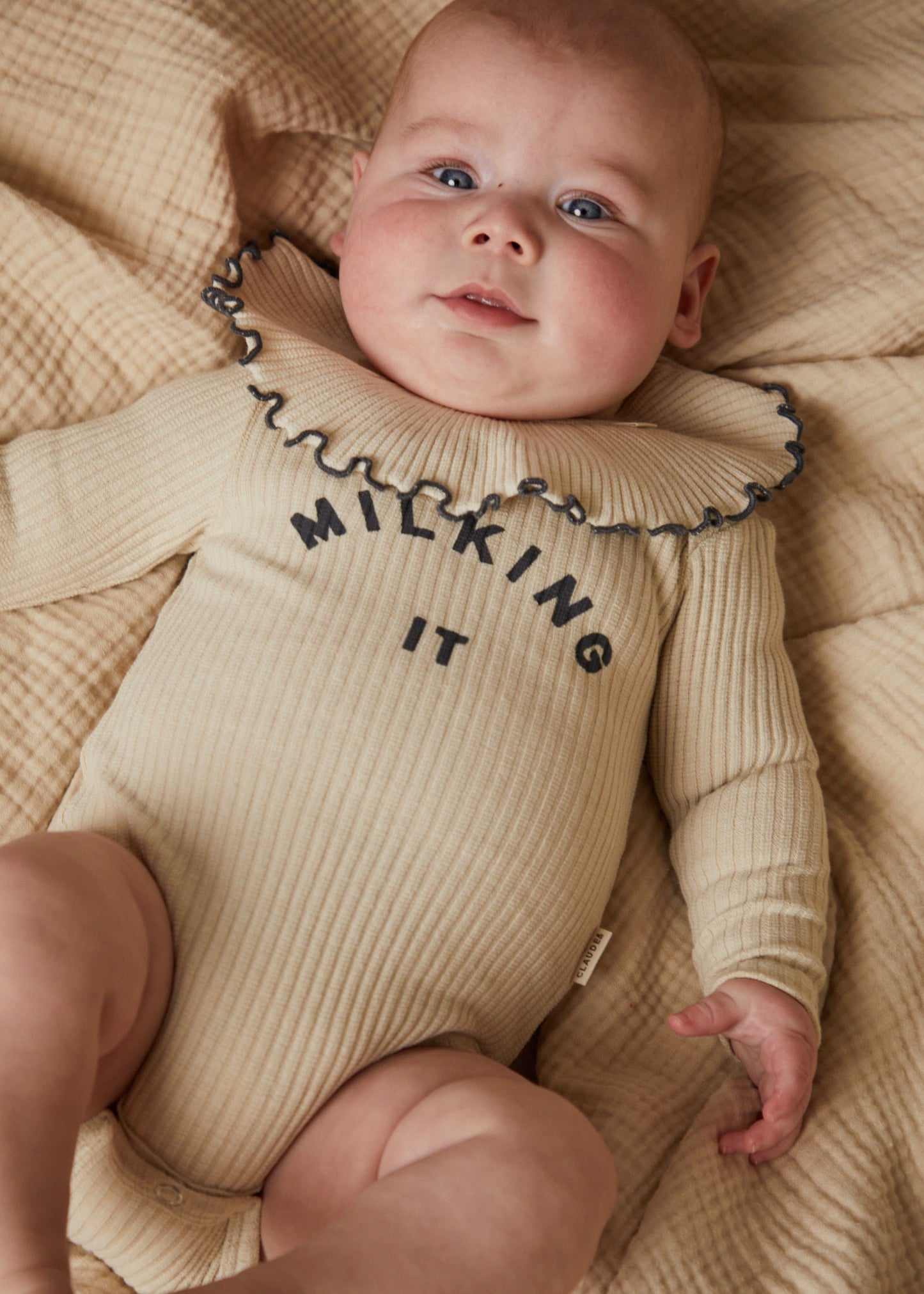 Our iconic oat, now in a body silhouette for everyday layering. Organic rib with gentle stretch, finished with a charcoal Milking It print.