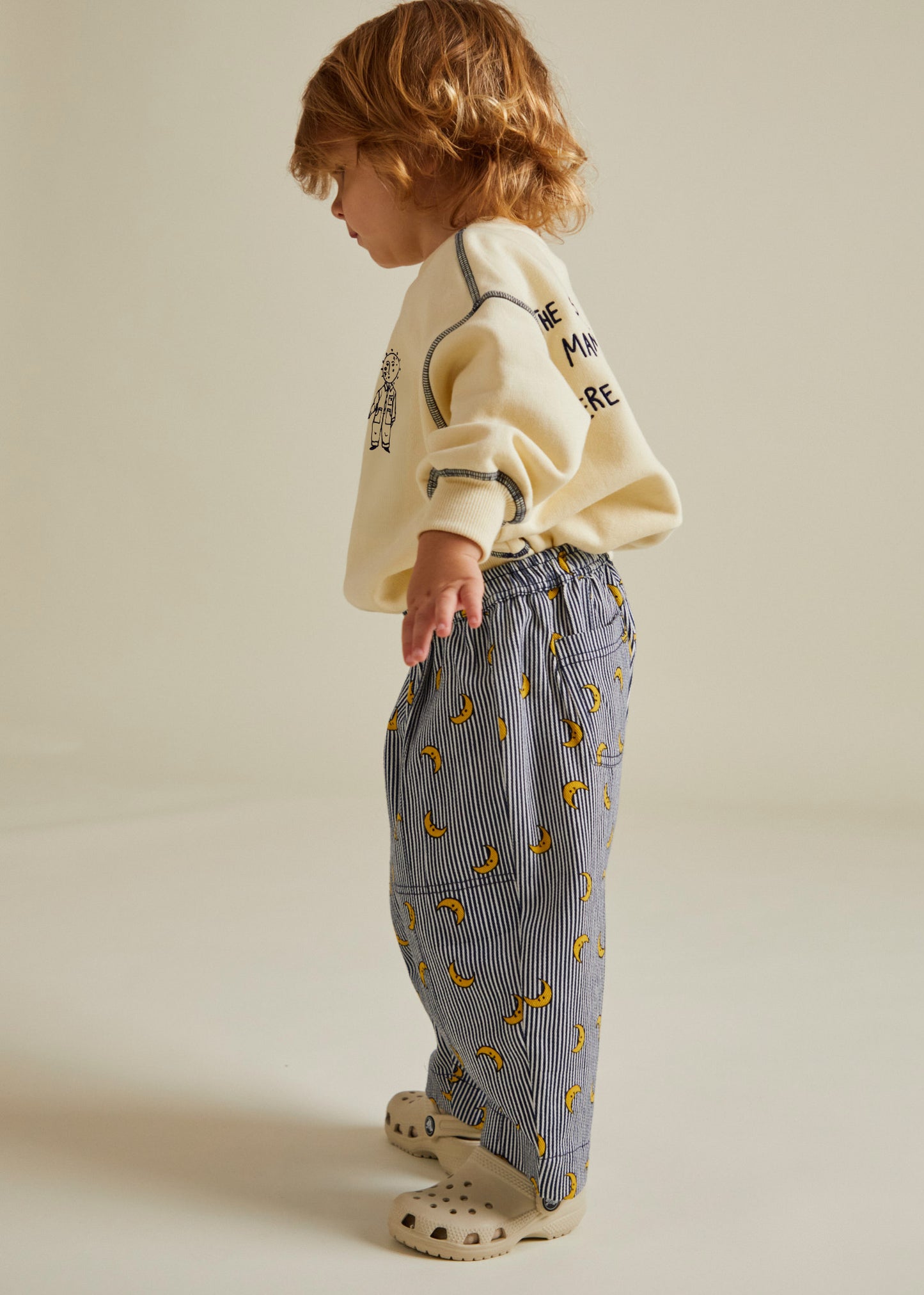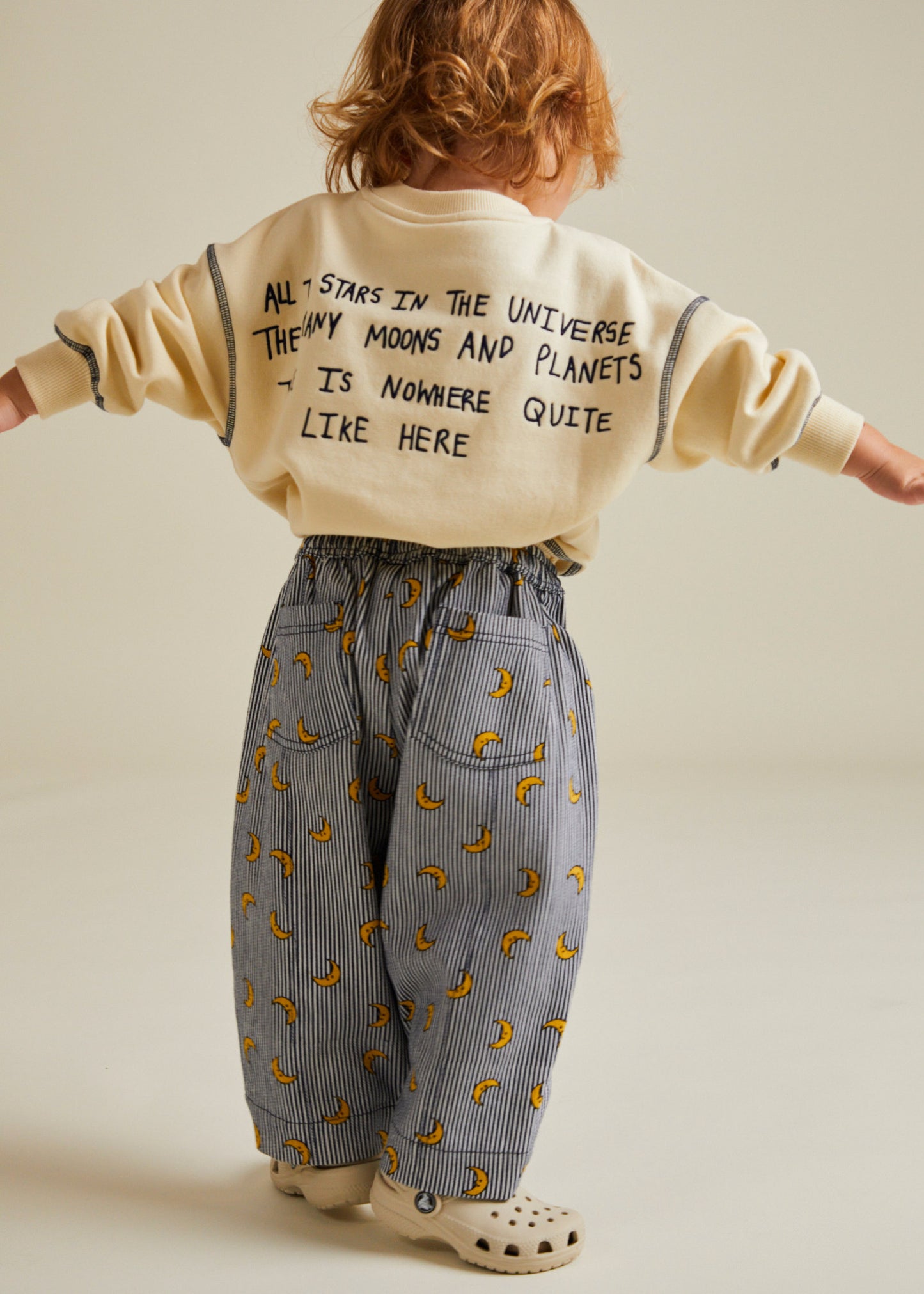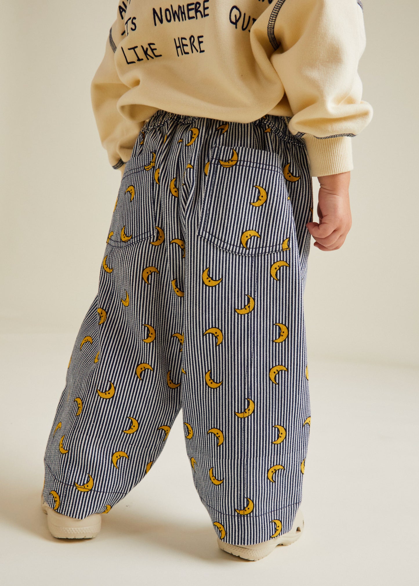 Introducing the Rex Moon Trousers, a unisex kids’ essential - full-length with a wide, baggy fit and a cool tapered balloon leg. Made from 100% organic cotton twill, they feature an all-over moon and stripe print, contrast cream stitching, and our signature Claude & Co branded waistband. Finished with a comfy elasticated waist, they’re designed for style and all-day play.